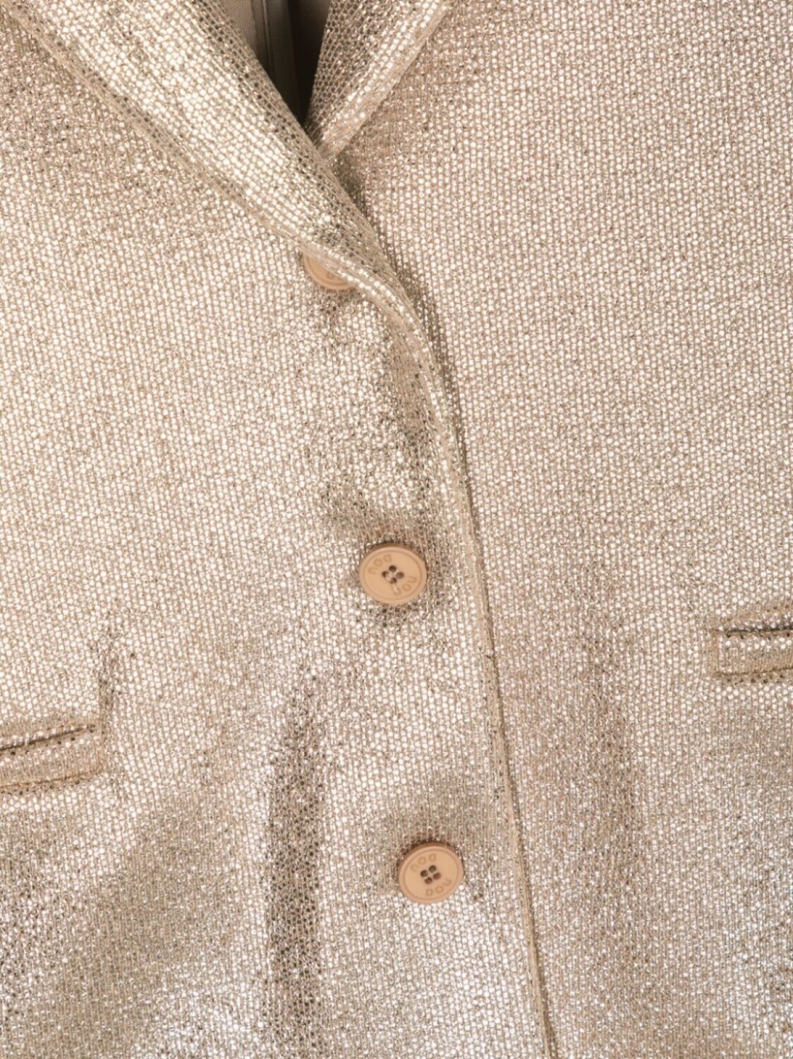 Золотистый, хлопок, эффект металлик, зазубренные лацканы, длинные рукава, застежка на пуговицах спереди, два передних кармана с листочкой, прорезной карман на груди и прямой подол.