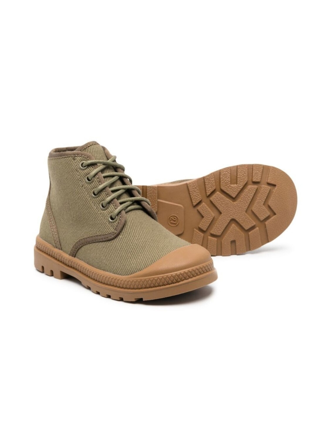 Хаки, бежевый, ткань в мелкий рубчик, вставки, закругленный носок, шнуровка спереди, высота по щиколотку и рифленая резиновая подошва.