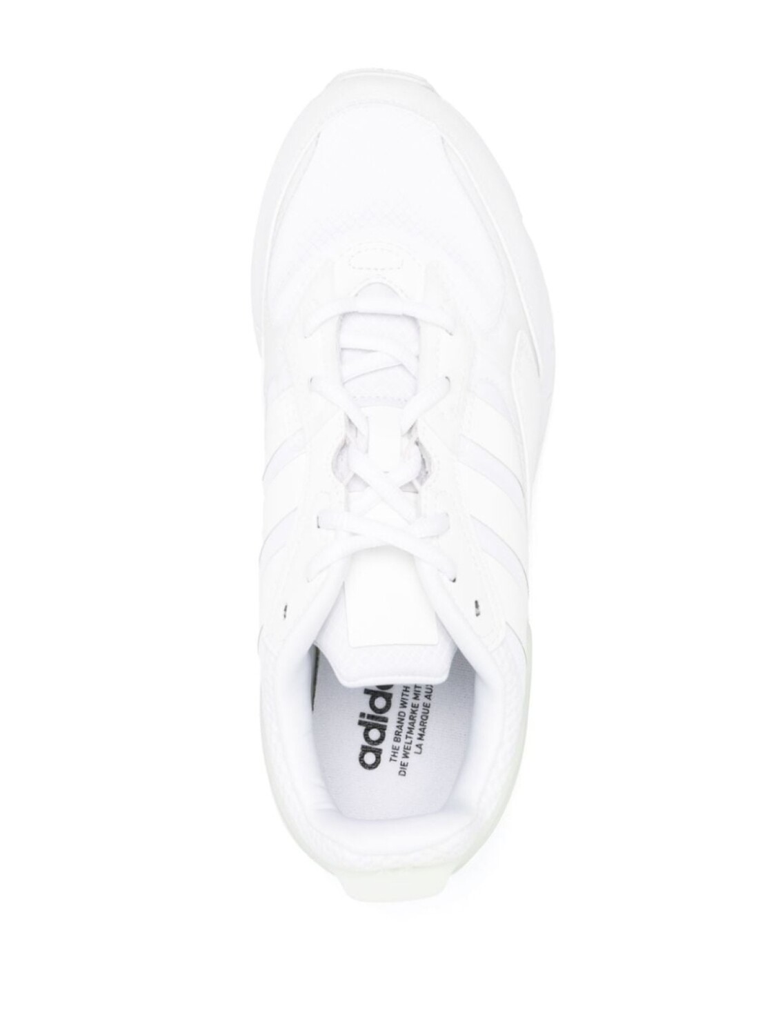 Белый, знаковый логотип 3-Stripes, нашивка с логотипом на язычке, тисненый логотип сзади, шнуровка спереди, миндалевидный носок, стелька с логотипом и резиновая подошва.