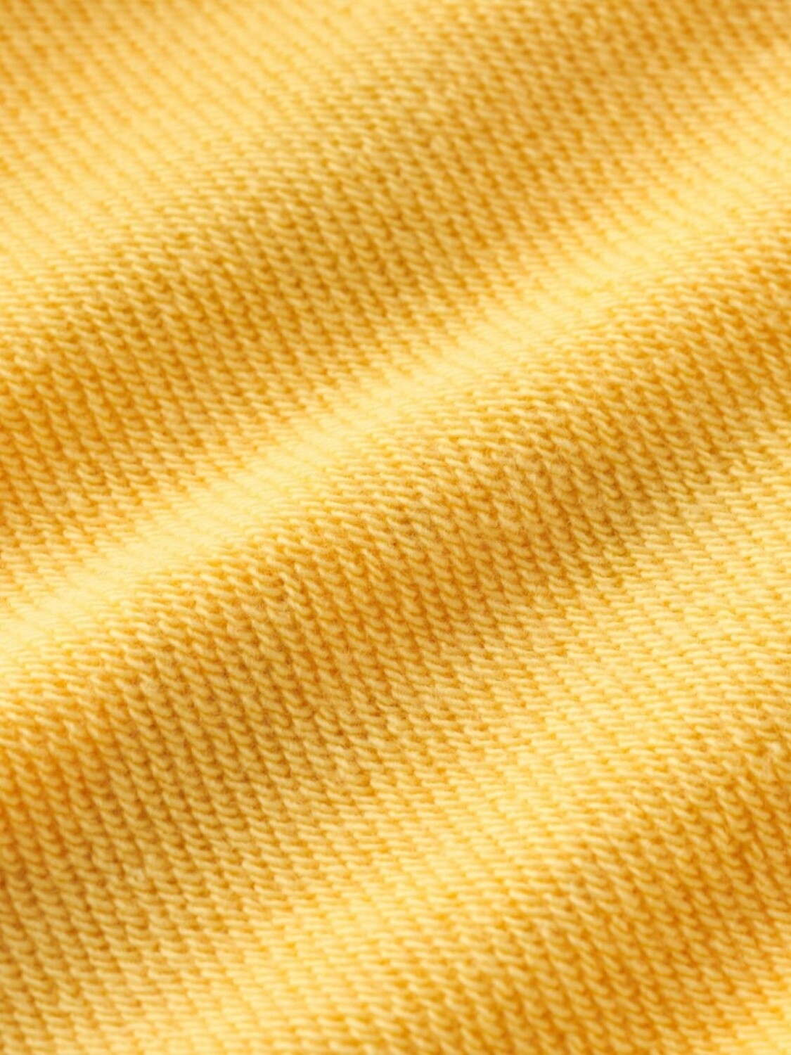 Желтый, застежка на кнопках на плече, подол и манжеты в рубчик, маленькая подвеска с логотипом, круглый вырез