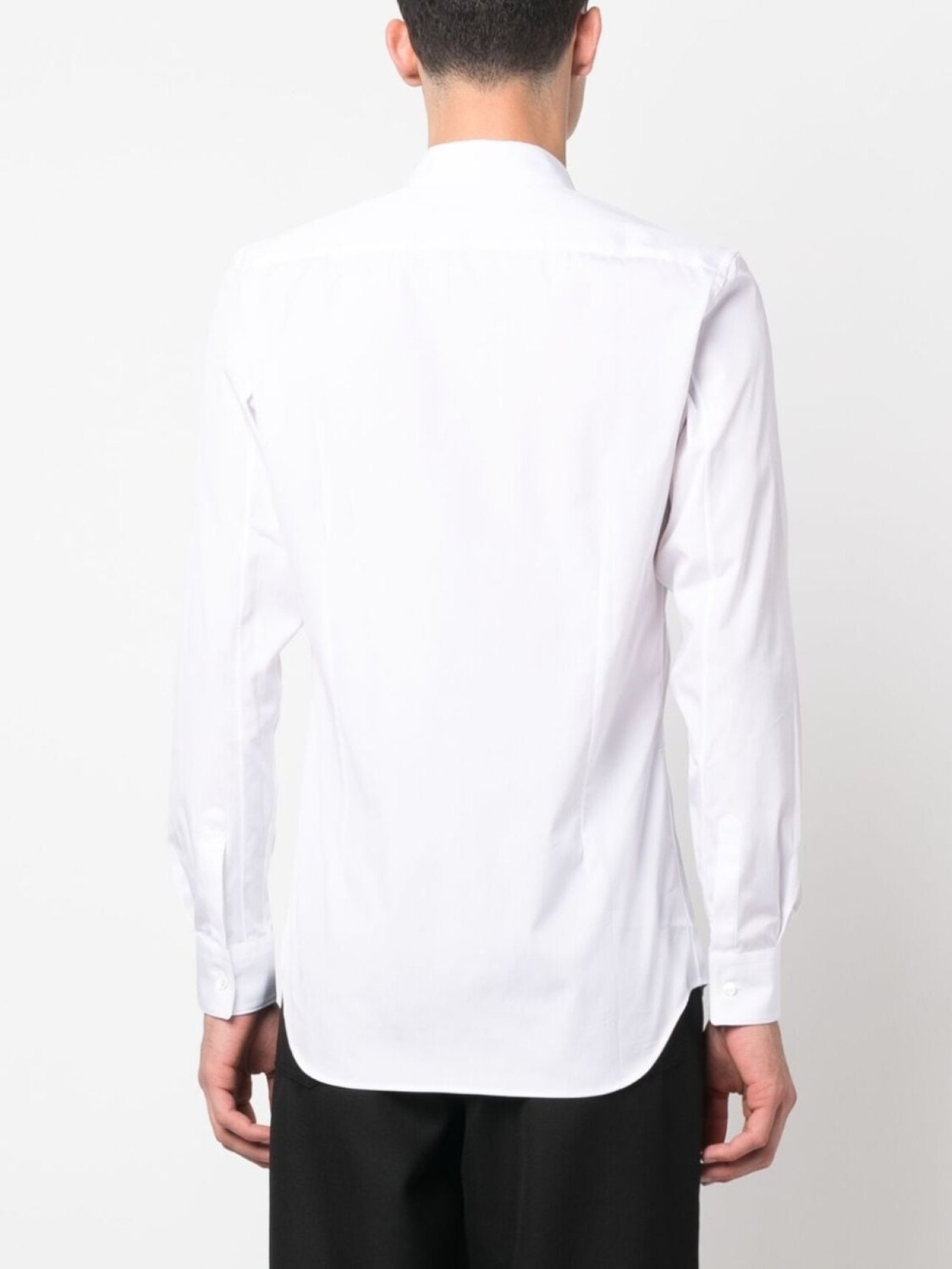 Белый, хлопок, поплин, прямой воротник, застежка на пуговицах спереди, длинные рукава, манжеты на пуговицах, нагрудный накладной карман и закругленный подол.