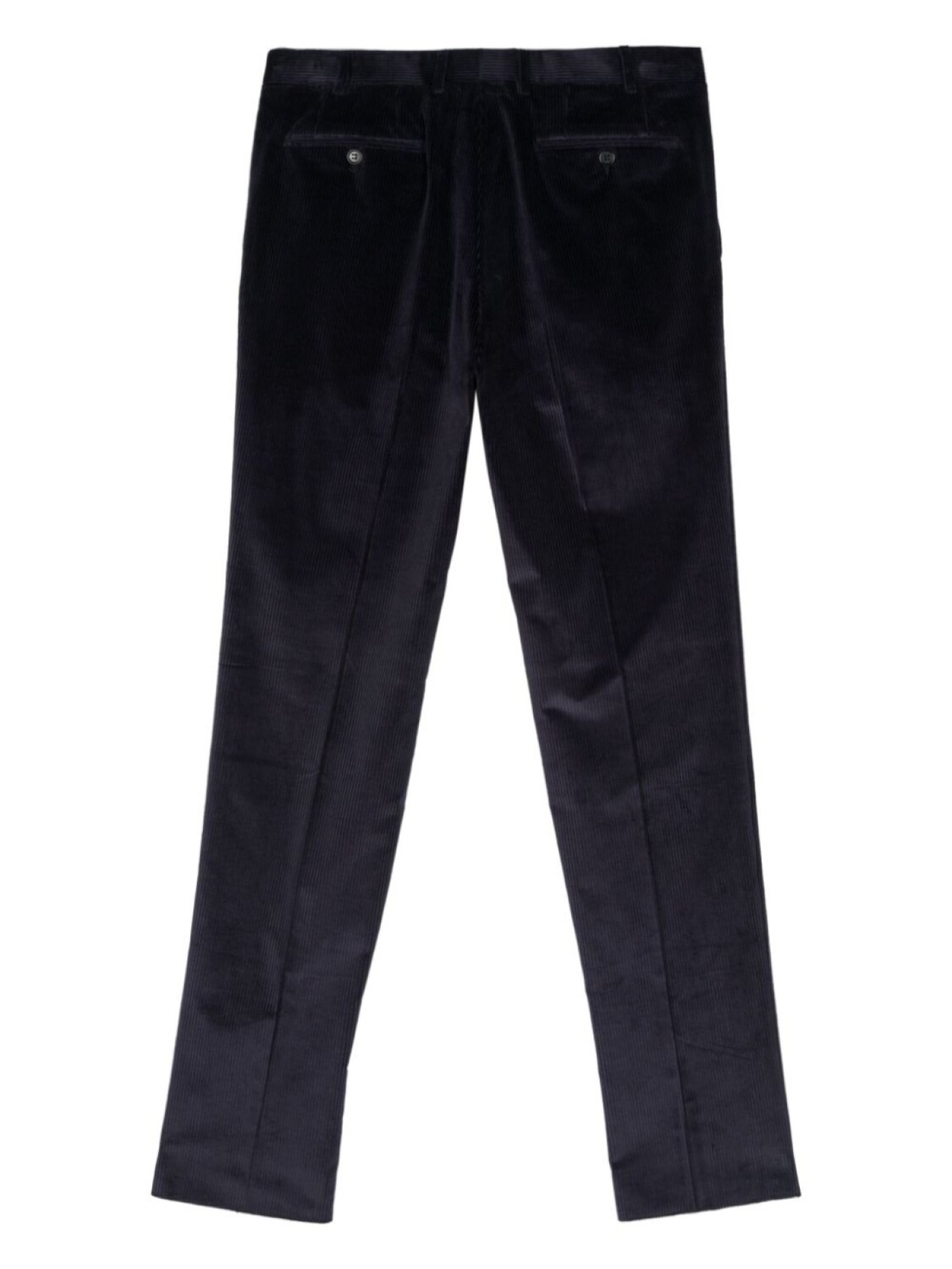 Темно-синий, эластичный хлопок, вельветовый материал, потайная застежка на молнии и пуговицах, петли для ремня, складки, два вшитых кармана по бокам, два прорезных кармана на пуговицах сзади