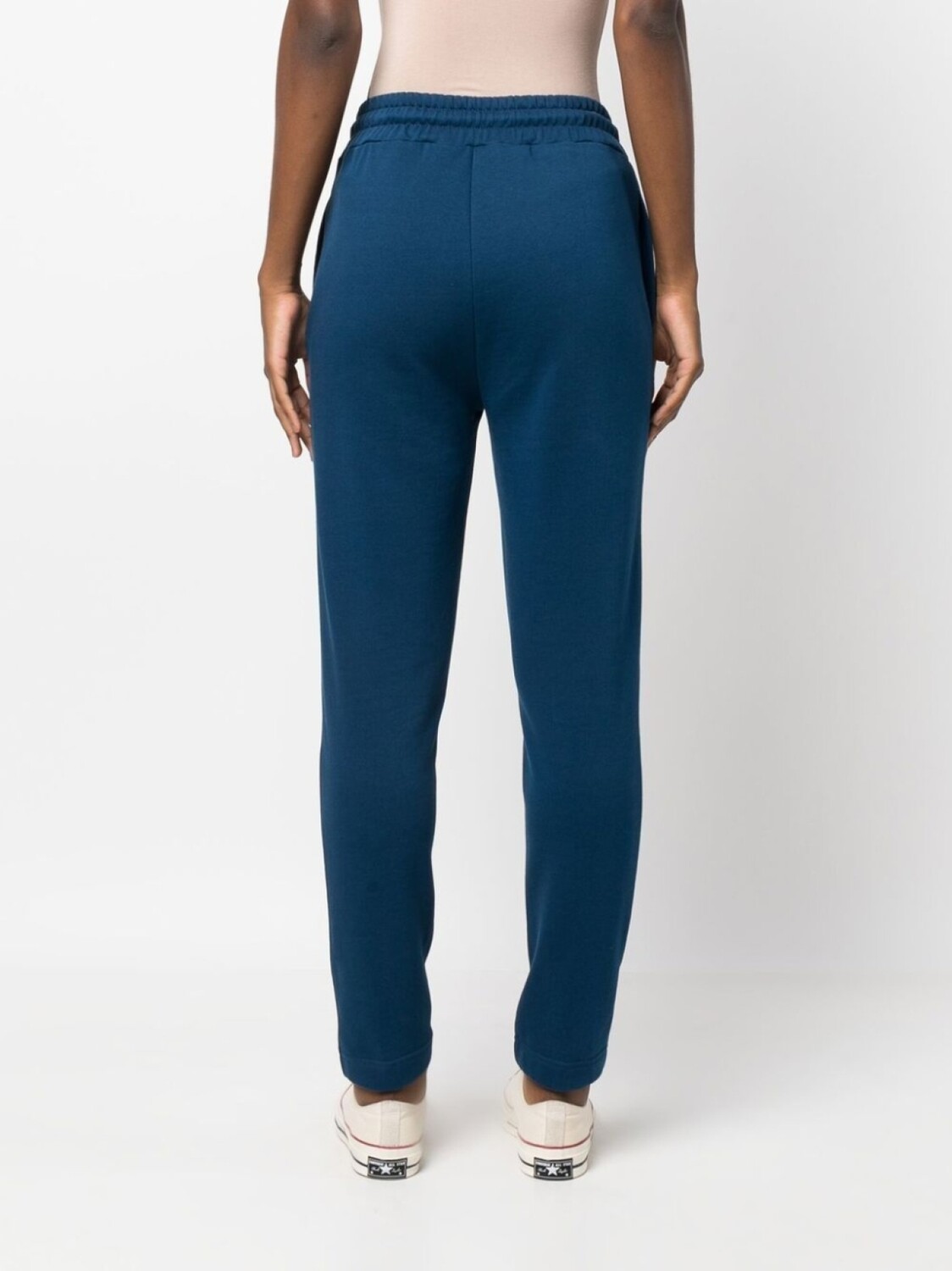 Темно-синий, хлопок, ткань джерси, вышитый логотип спереди, строчка в тон, средняя посадка, зауженный крой, кулиска на талии и два вшитых кармана по бокам.