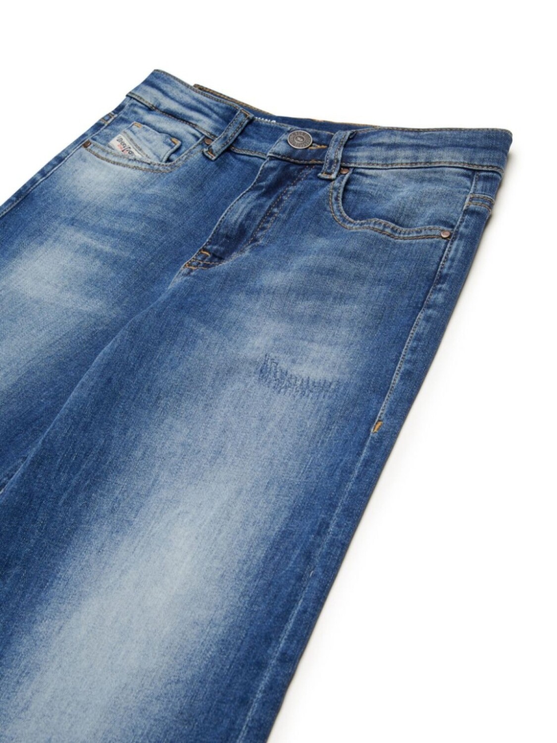 Синяя застежка на пуговицы, классическая модель с пятью карманами, нашивка с логотипом сзади, потертая отделка