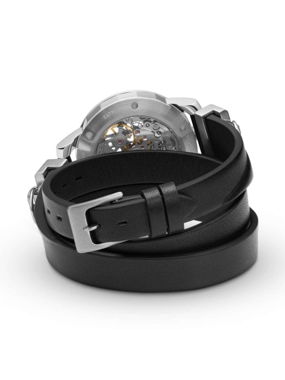 Подробнее о товаре: • 36 мм • корпус из нержавеющей стали • автоматический механизм • круглый корпус • частично открытый циферблат • циферблат с индексами • прямоугольные вытянутые стрелки • сапфировое стекло • антибликовое покрытие • скелетированная задняя крышка • браслет в несколько оборотов • сменный ремень • запас хода — 40 часов • водонепроницаемость до 50 метров/5 АТМ