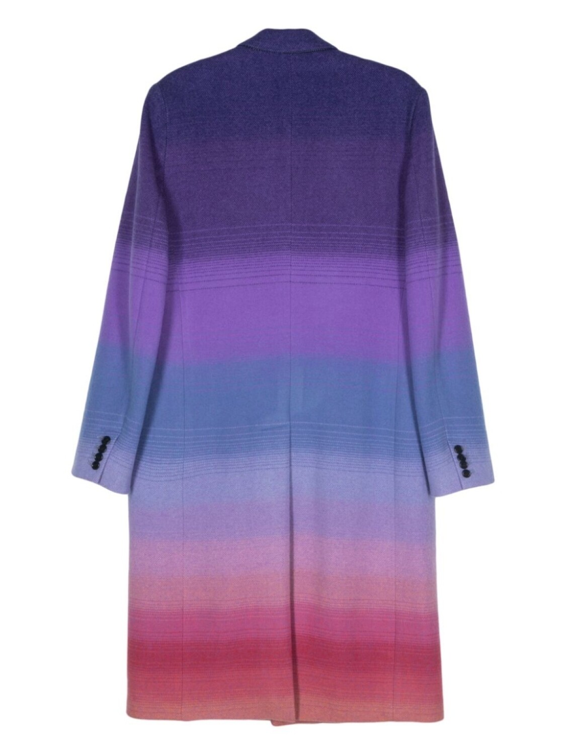 Фиолетовый/разноцветный, смесь шерсти и кашемира, градиентный эффект, матовый эффект, зазубренные лацканы, подплечники, длинные рукава, манжеты на пуговицах, два передних кармана с клапанами, прорезной карман на груди, шлица по центру сзади, внутренние прорезные карманы, цельная подкладка, застежка на пуговицах спереди