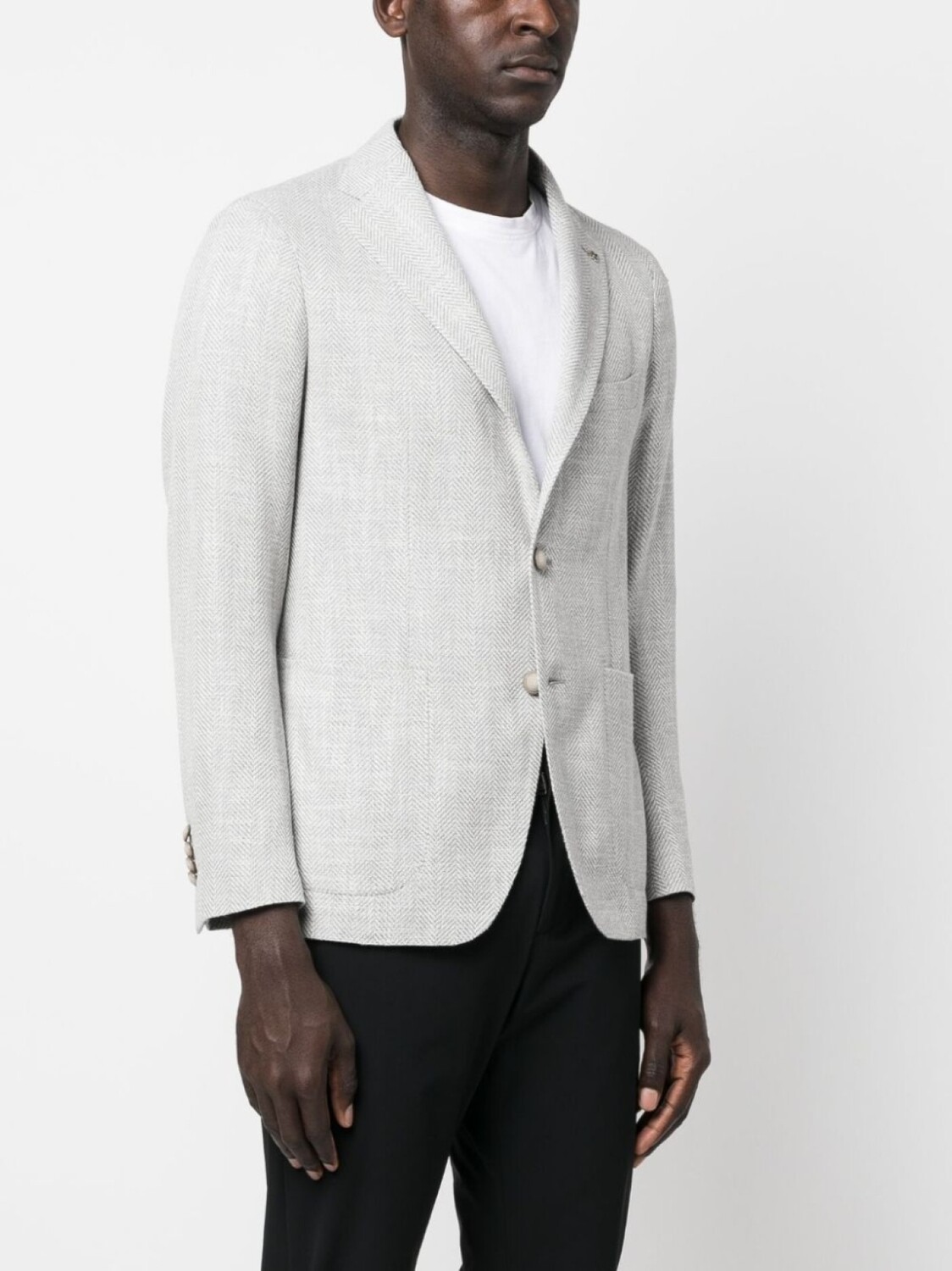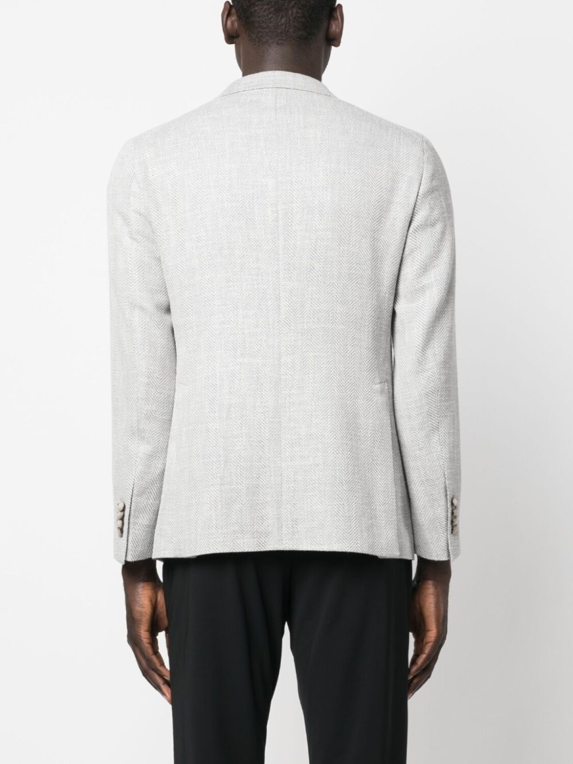 Светло-серый, смесь шелка и вирджинской шерсти, принт в елочку, металлический логотип, зазубренные лацканы, застежка на пуговицах спереди, прорезной карман на груди, два накладных кармана спереди, подплечники, длинные рукава, манжеты на пуговицах и две боковые шлицы сзади.
