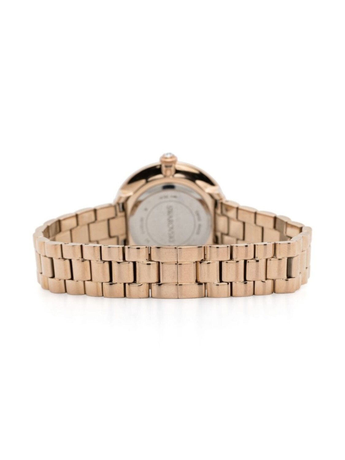 Подробнее о товаре: • 30 мм • нержавеющая сталь золотистого оттенка • кварцевый механизм • круглый корпус • циферблат с узором Sunray и логотипом • три индекса с кристаллами огранки «багет» • серебристая задняя крышка с гравировкой • инкрустация кристаллами Swarovski с глухой закрепкой • золотистый металлический браслет • застежка-бабочка • декор из кристаллов на короке • водонепроницаемость до 50 метров/5 АТМ