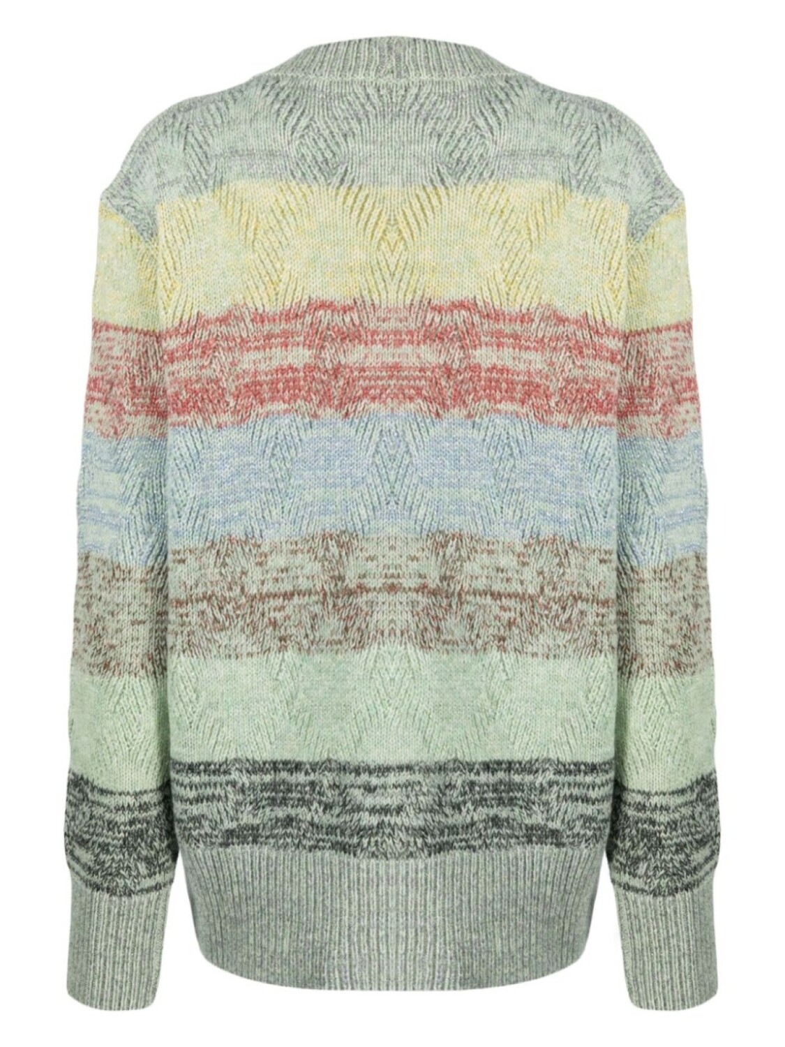 Светло-зеленый, разноцветный, смесовая шерсть, трикотажный материал, вязаные края в рубчик, эффект потертости, узор в горизонтальную полоску, контрастная отделка, V-образный вырез, застежка на пуговицах спереди, длинные рукава, два накладных кармана спереди и прямой подол.