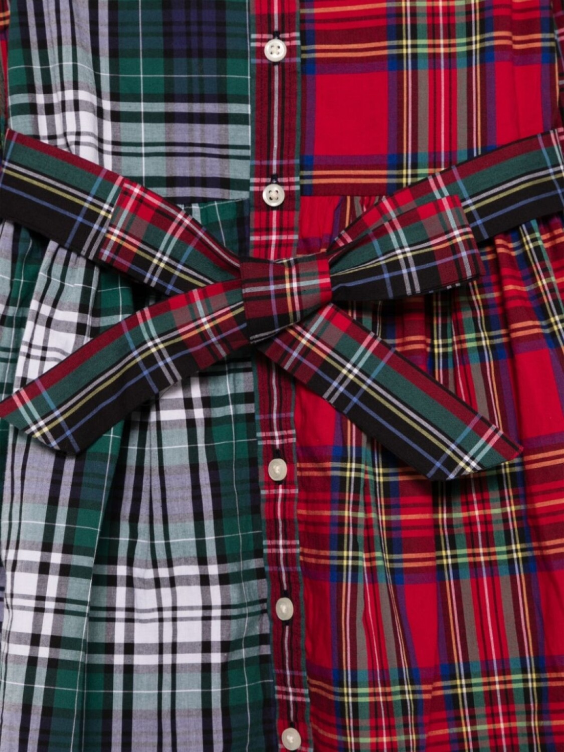 Красная застежка на пуговицы спереди, пояс на талии, два боковых кармана, узор в клетку
