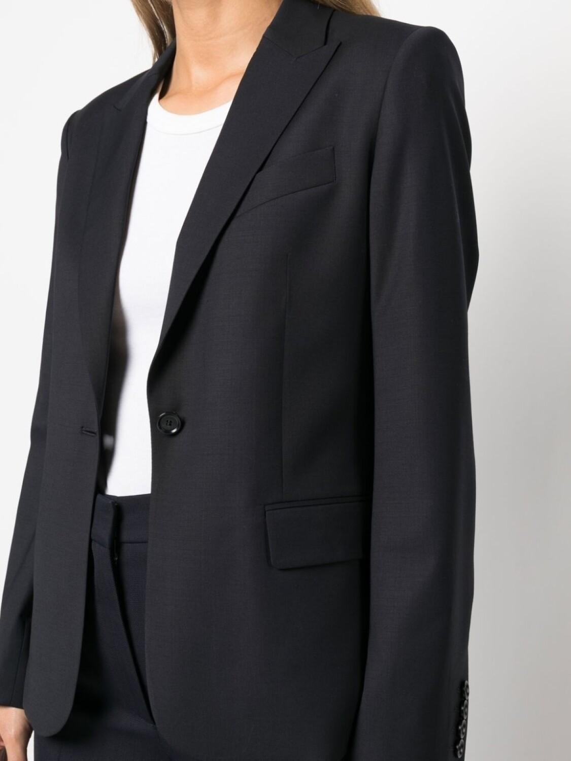 Темно-синий, эластичная шерсть, строгий крой, заостренные лацканы, застежка на пуговицах спереди, прорезной карман на груди, два передних кармана с клапанами, манжеты на пуговицах, длинные рукава и шлица по центру сзади.