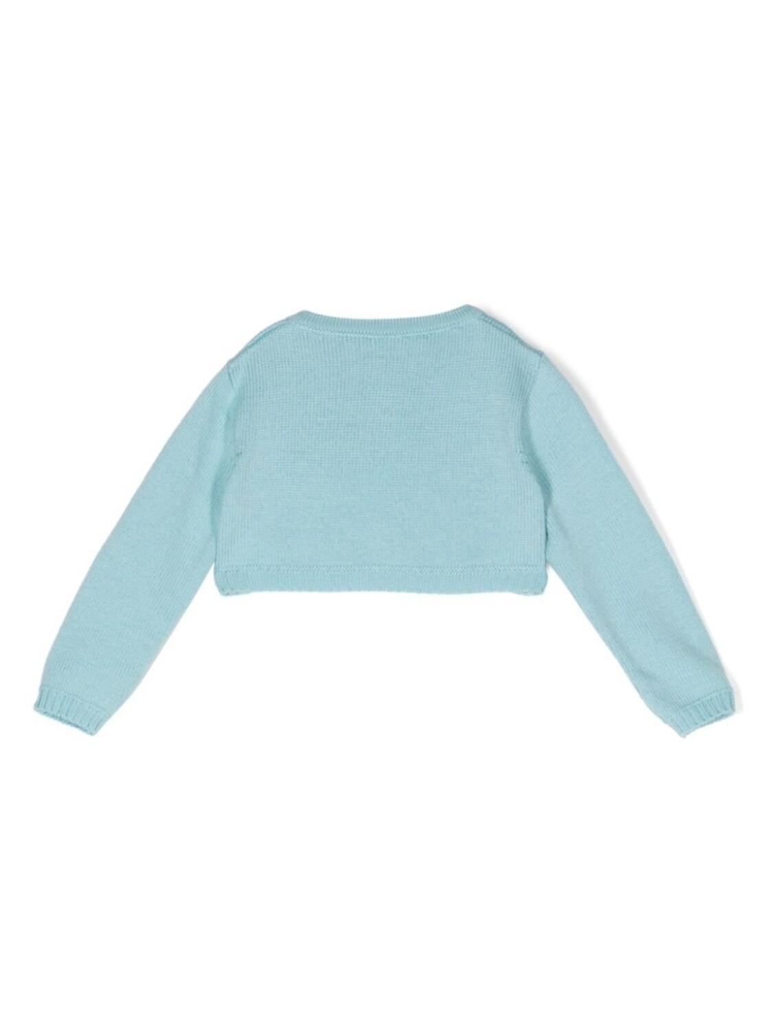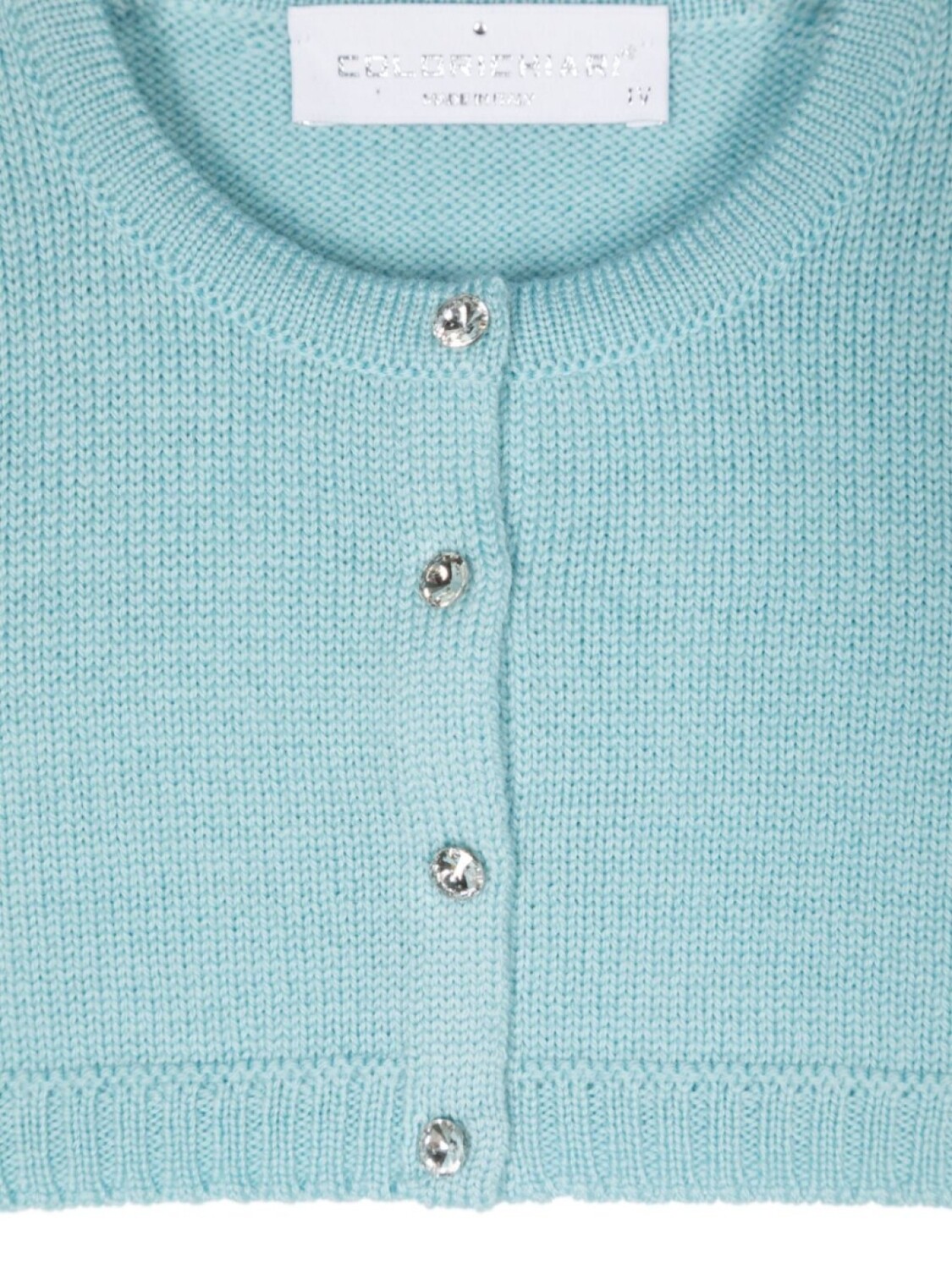 Зеленовато-голубой, шерсть, вязаный дизайн, пуговицы с кристаллами, планка на пуговицах спереди, круглый вырез, длинные рукава, подол и манжеты в рубчик, укороченная длина