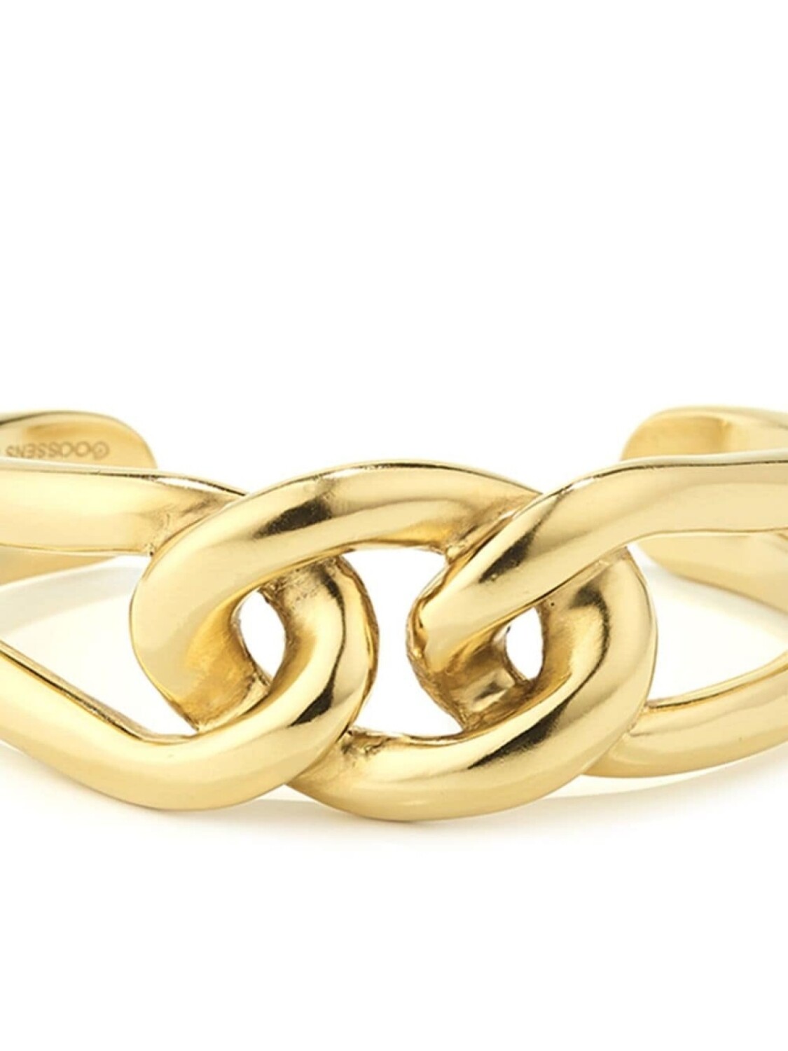 Цепочный браслет Lhassa от Goossens. Изогнутая форма, модель слип-он, без застежки и гравировка логотипа.