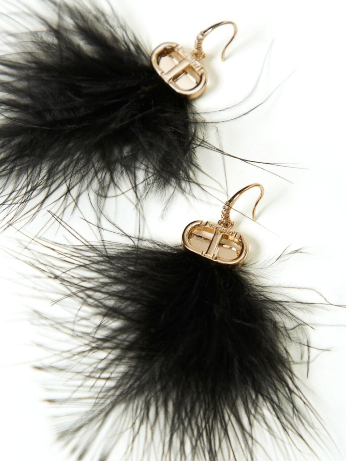 Аппликация с логотипом из золотистого тона/черной латуни/перьев для проколотых ушей. Эти серьги продаются парой.