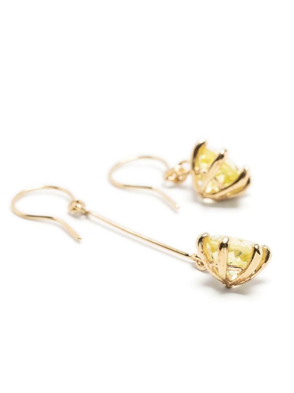 Золотистый, желтый цитрон, топаз, вставка с камнями, асимметричная форма, серьги-подвески и застежка на крючок. В комплект входят две серьги.