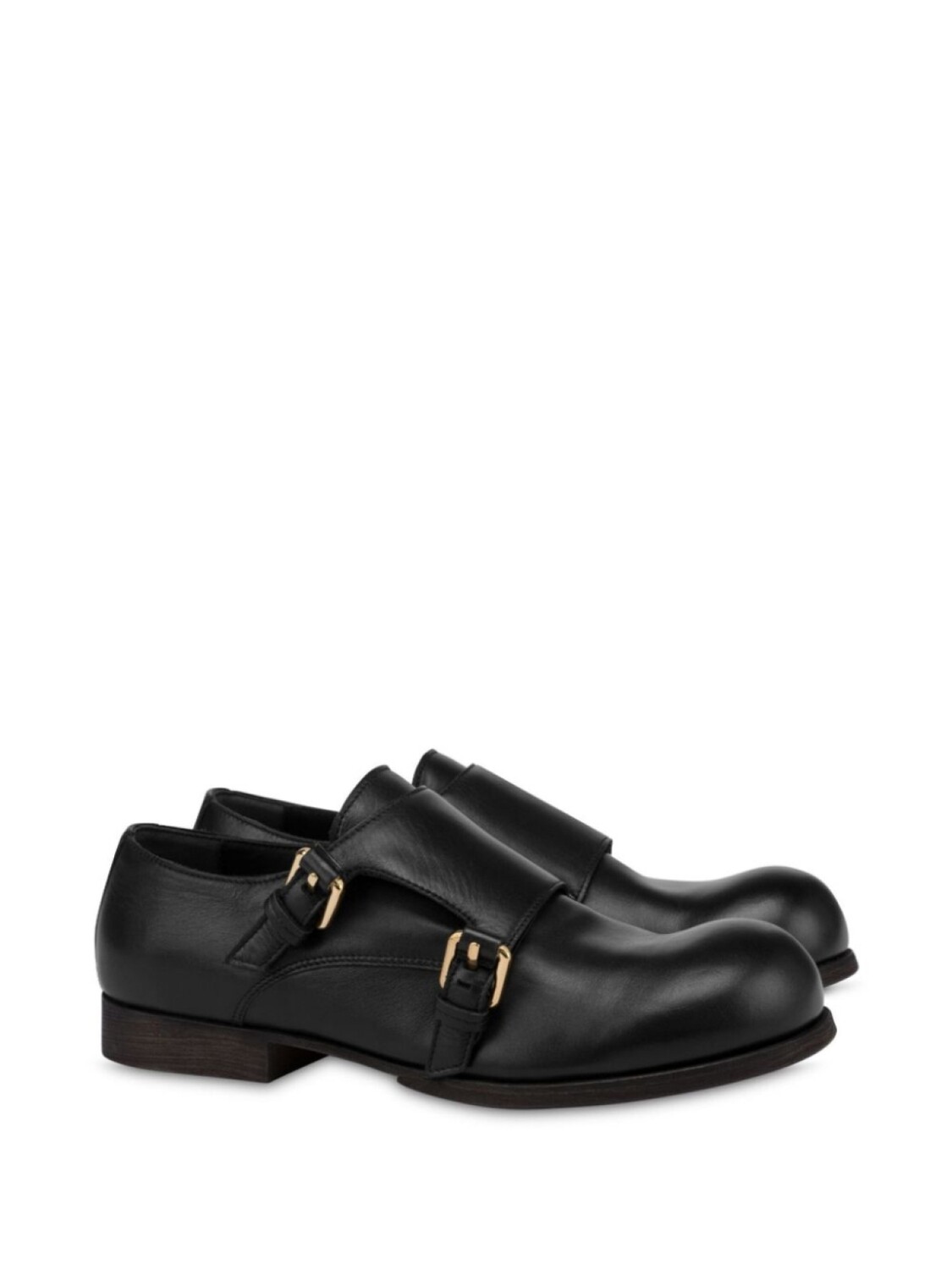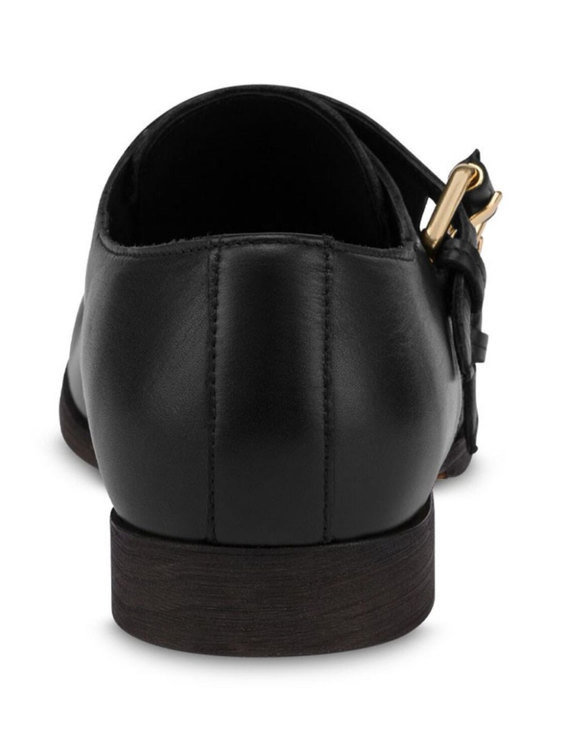 Черный, телячья кожа, боковые застежки с пряжками, миндалевидный носок, низкий наборный каблук, кожаная подошва