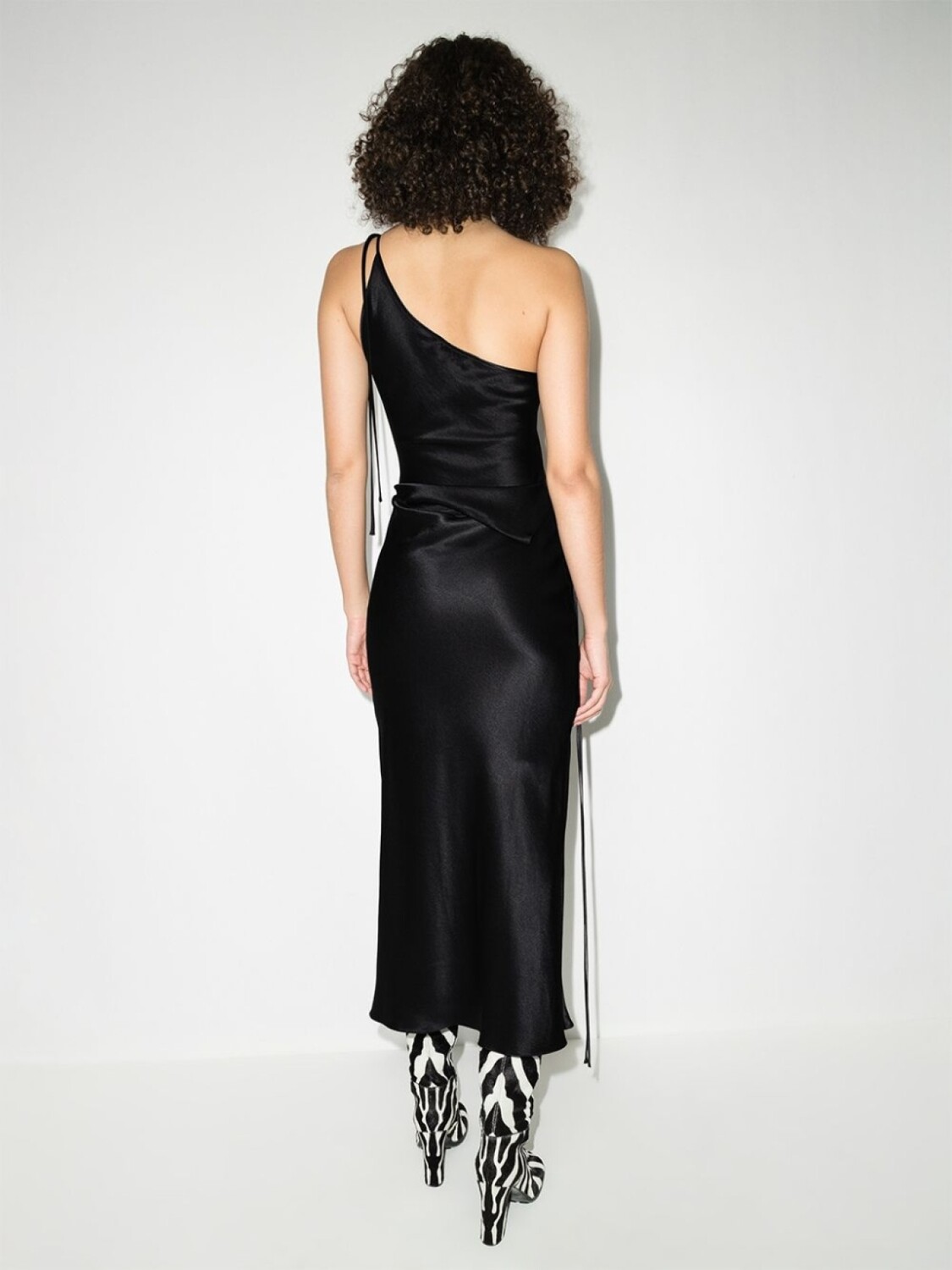 Асимметричная форма, модель на одном плече и длина миди. Цвет: черный.