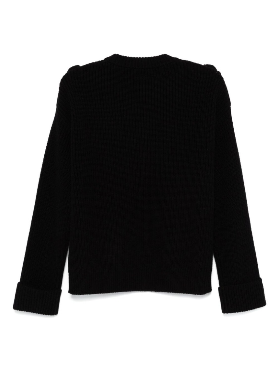 Черный, смесь шерсти и кашемира, крупная вязка, ткань в мелкий рубчик, круглый вырез, эполеты, длинные рукава, подвернутые манжеты, прямой подол