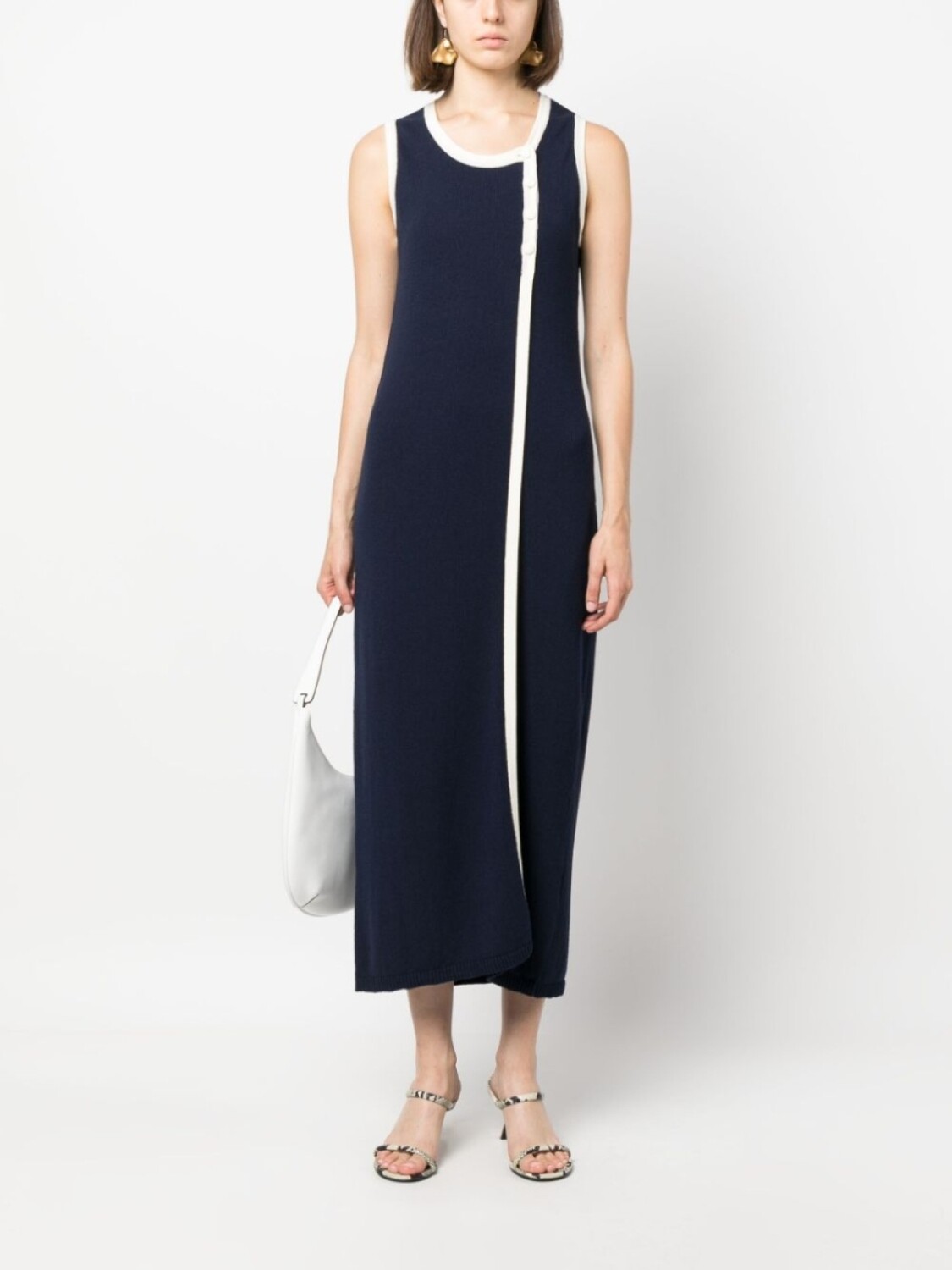 Темно-синий, белый, смесовый хлопок, U-образный вырез, смещенная застежка на пуговицах спереди, широкие бретели, без рукавов, силуэт «комбинация» и длина до середины икры.
