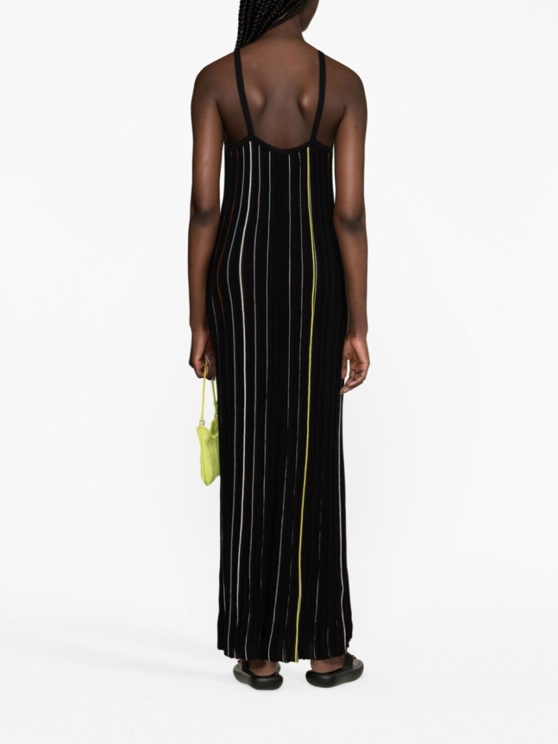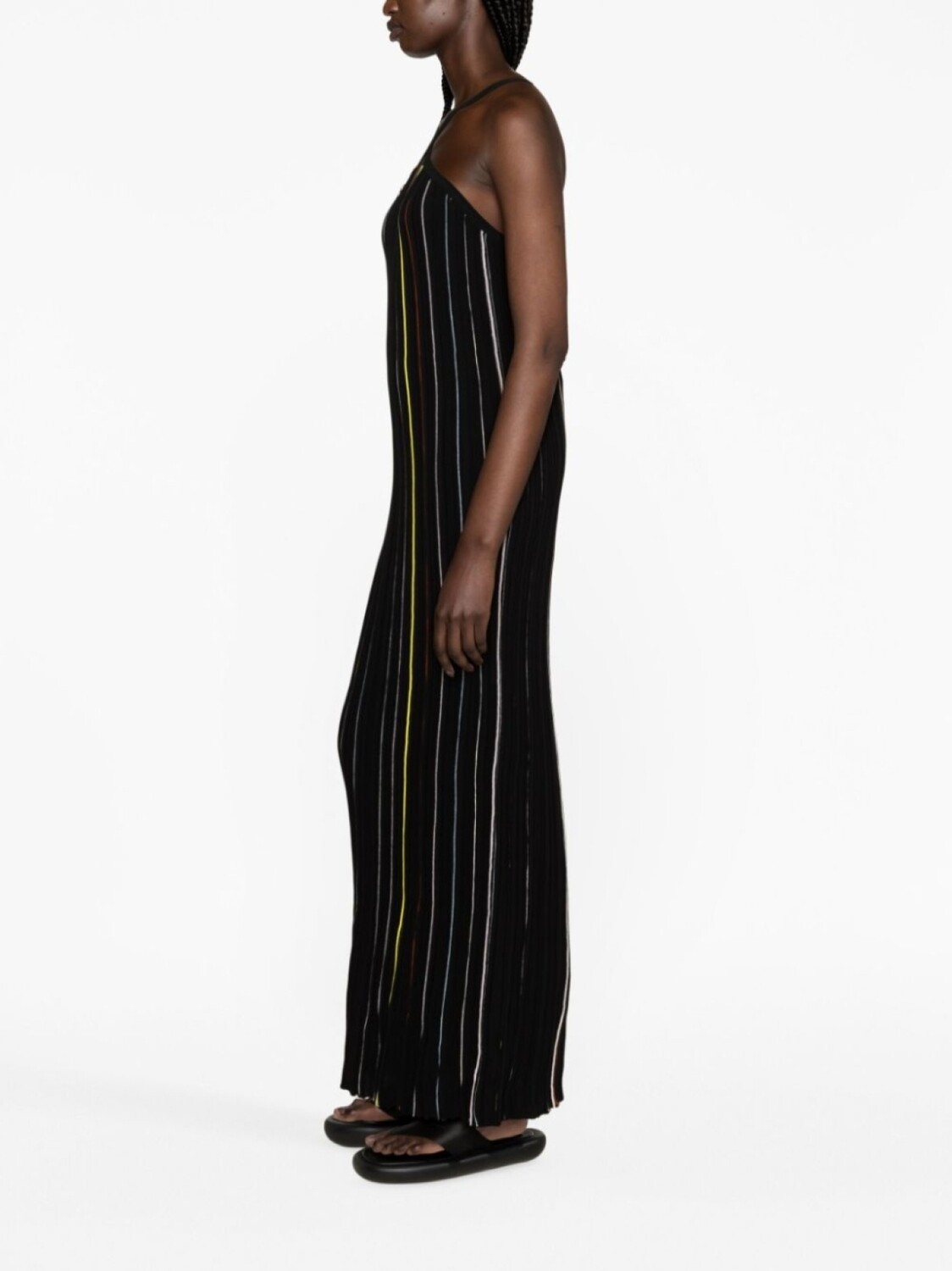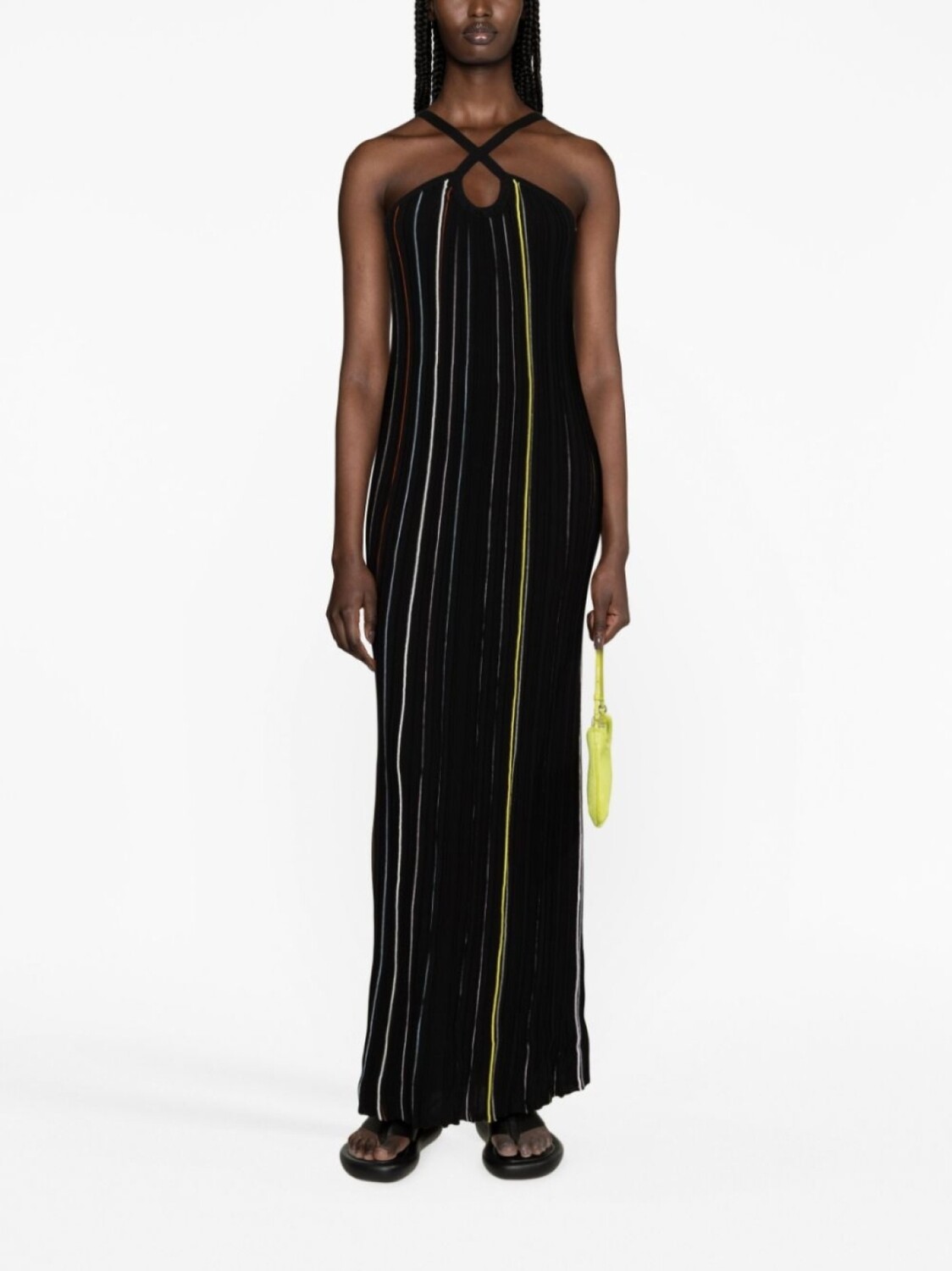 Черный/разноцветный, смесовый хлопок, трикотажный материал, узор в вертикальную полоску, перекрестные ремешки и длина макси.
