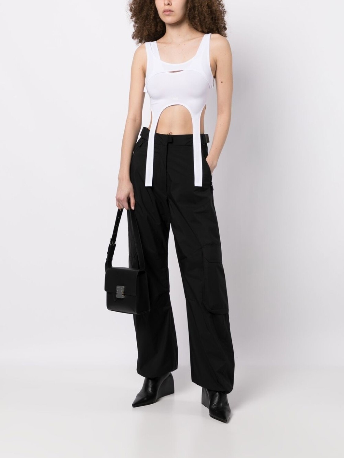 Белый, эластичный материал, ткань джерси, многослойный дизайн, вырезные детали, U-образный вырез, широкие бретели, без рукавов и застежка на крючок сзади.