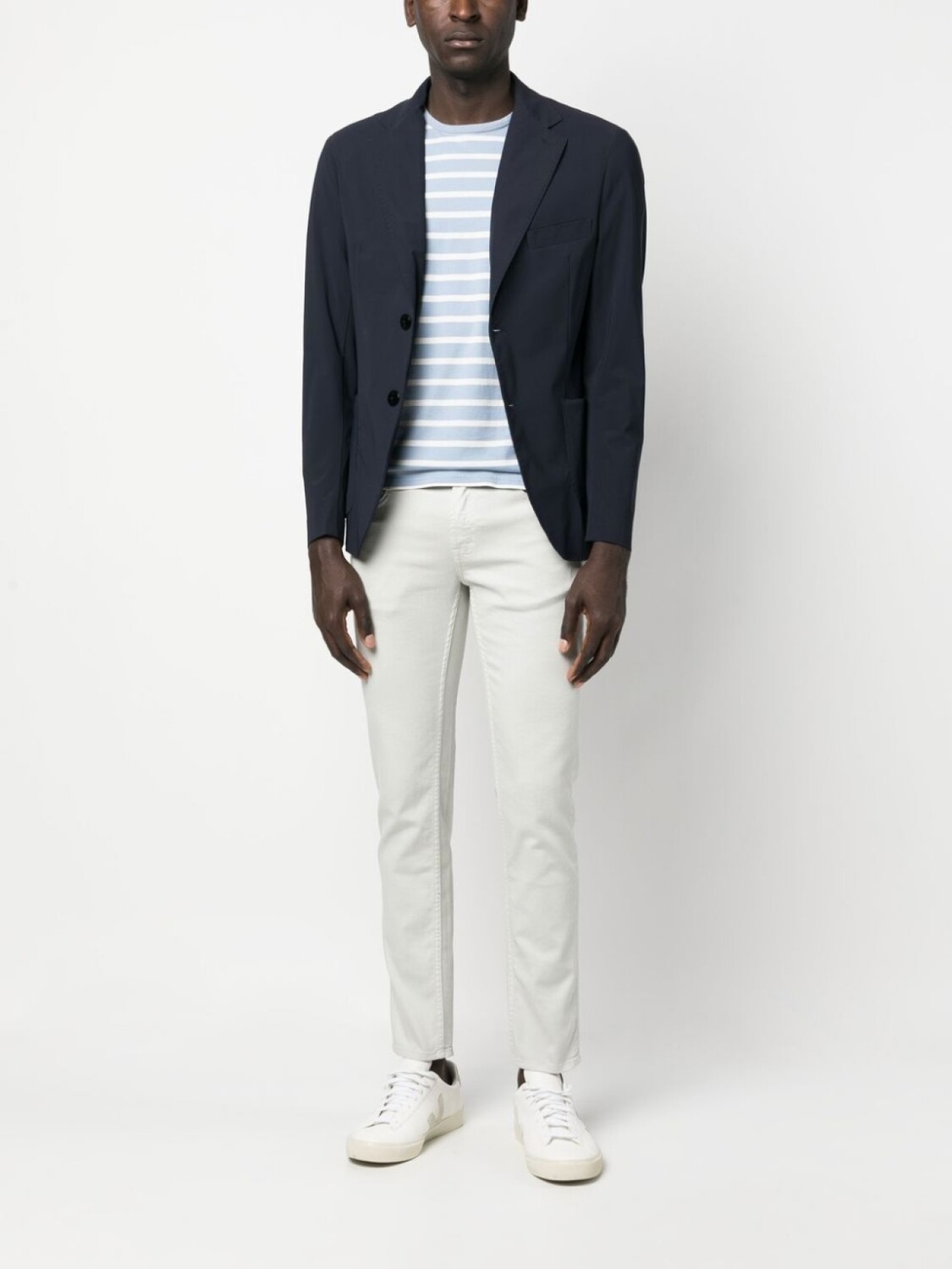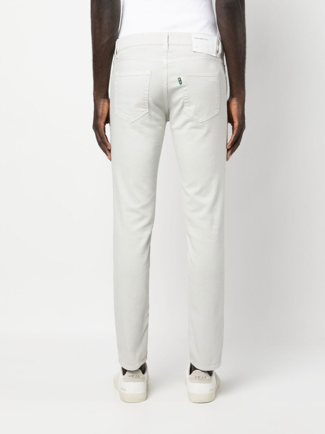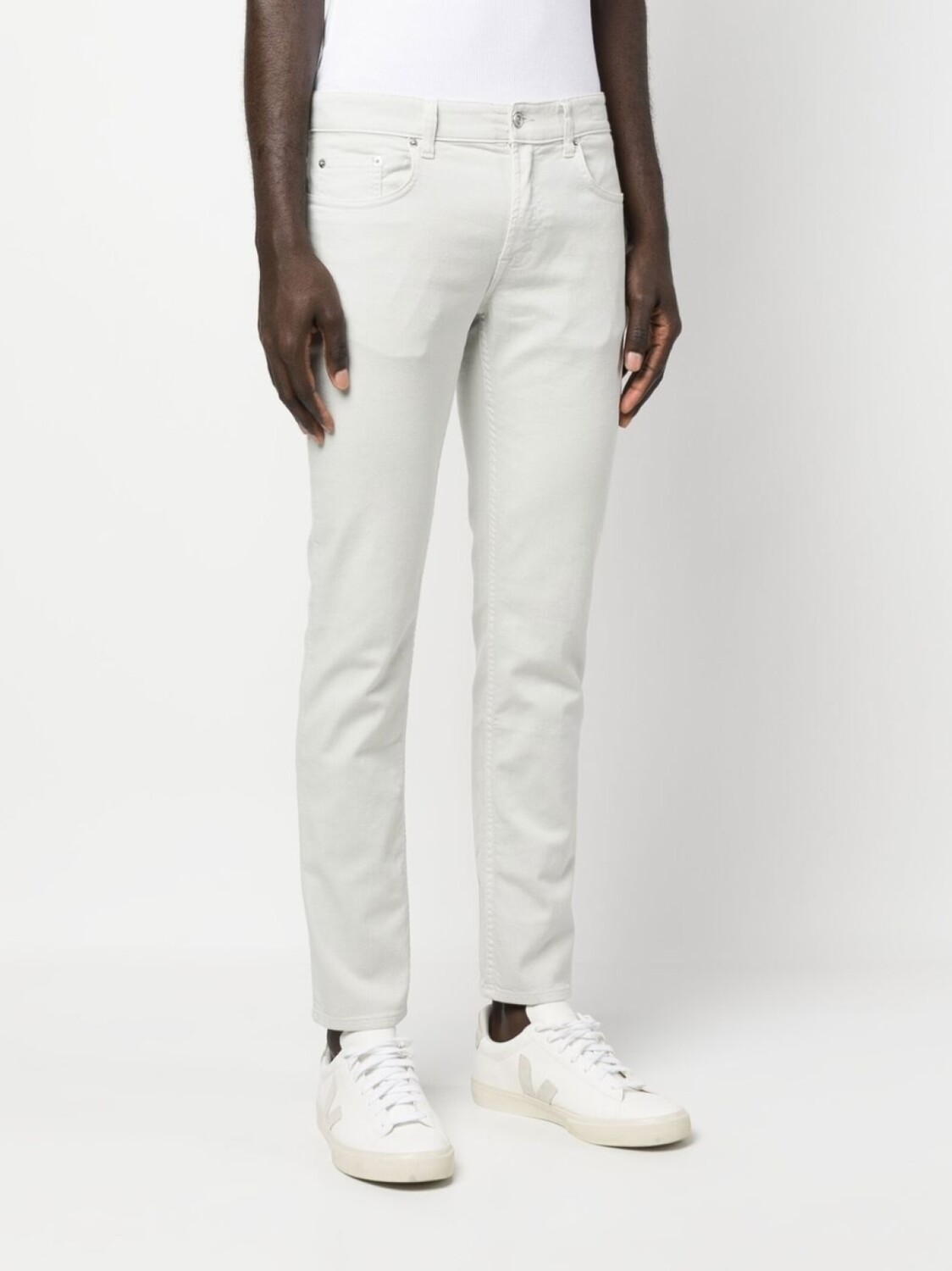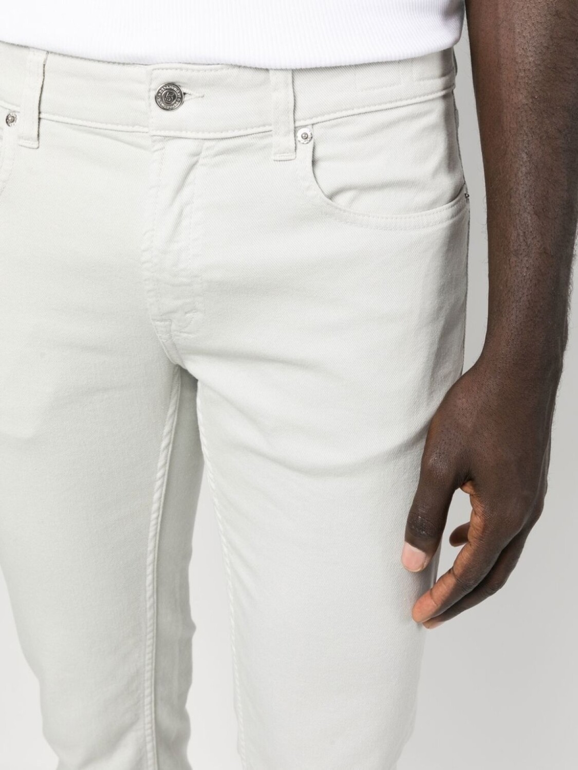 Кремовый, эластичный хлопок, деним, нашивка с логотипом сзади, пуговицы с тисненым логотипом, петли для ремня, ширинка на пуговицах, пять карманов и узкий крой.