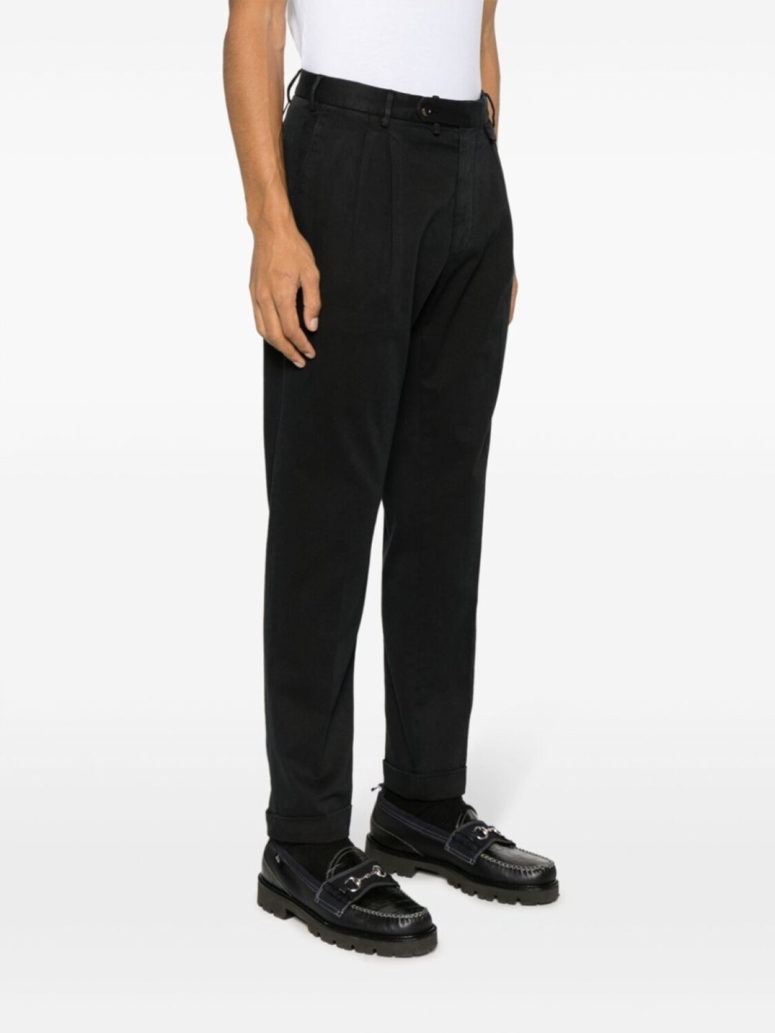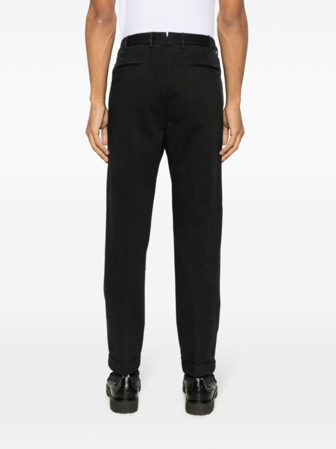 Черный, эластичный хлопок, саржевое переплетение, складки, классический крой, петли для ремня, смещенная застежка на пуговицах спереди, зауженный крой, два прорезных кармана по бокам, два прорезных кармана сзади и подвернутые манжеты.