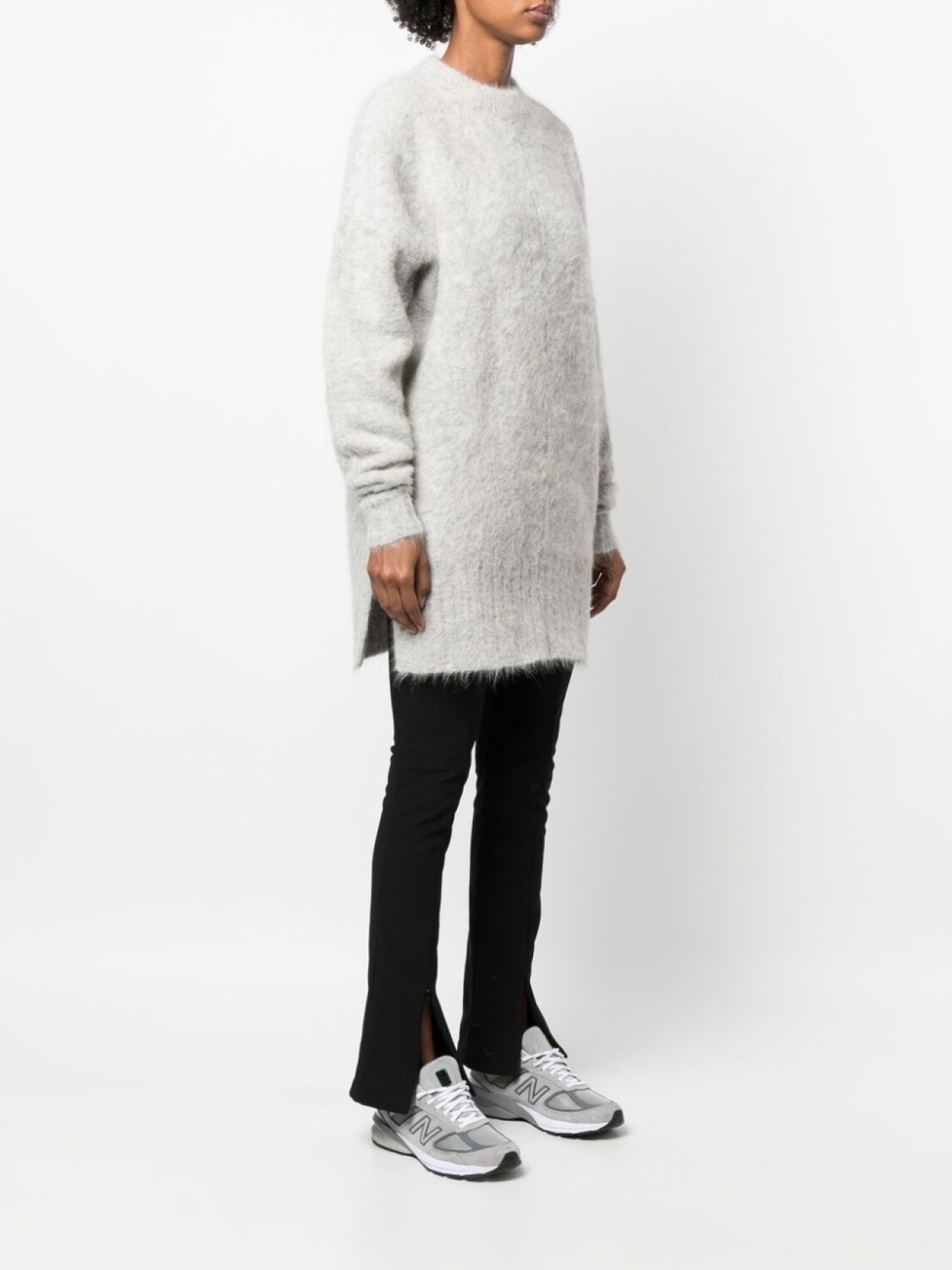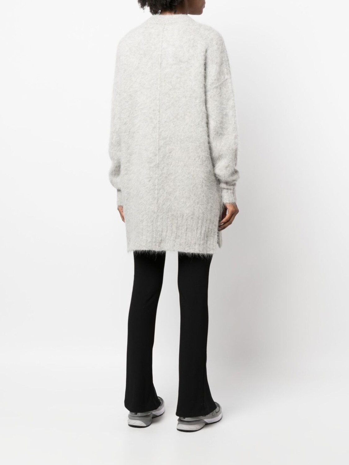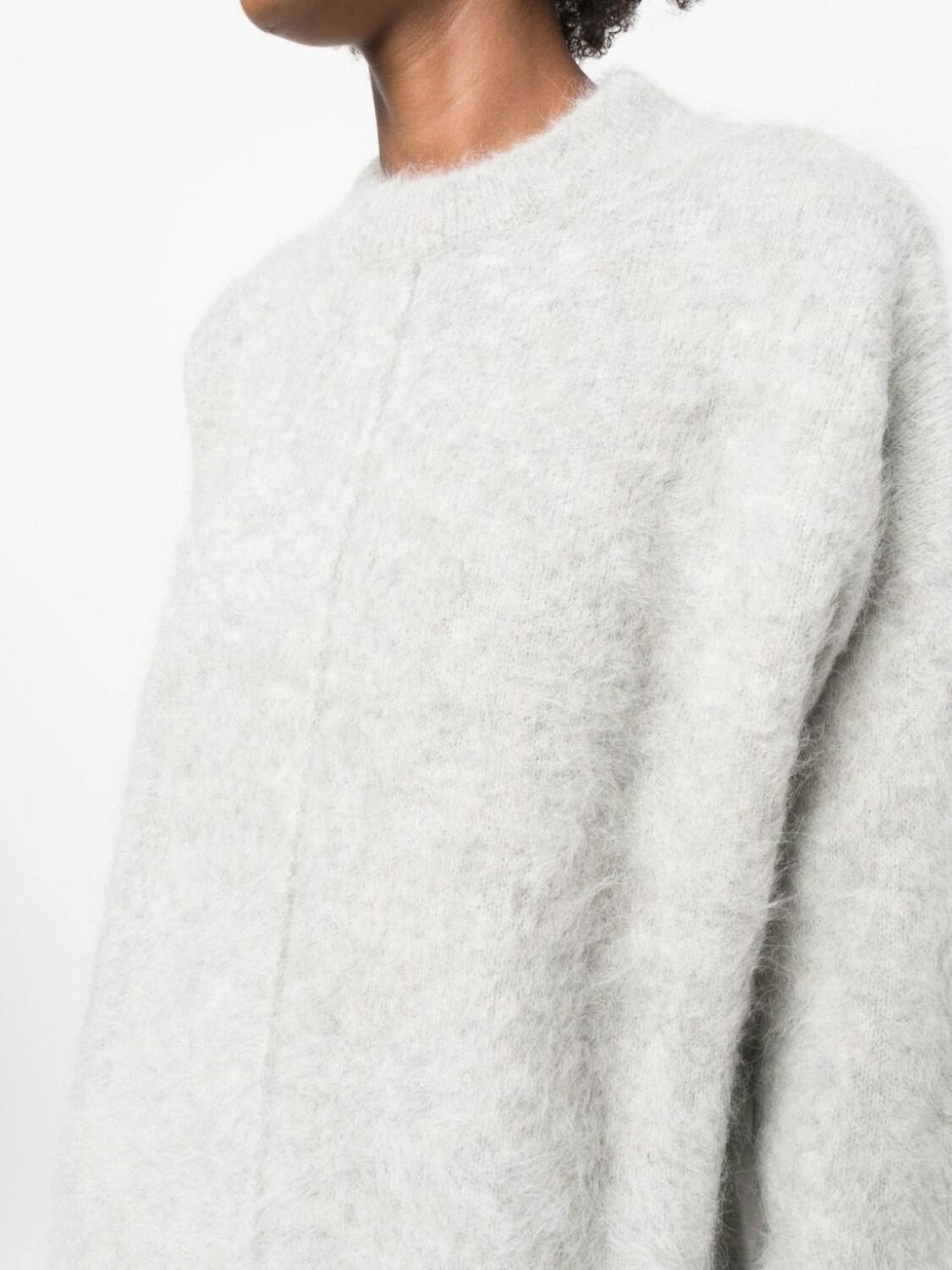Светло-серый, смесовая шерсть альпаки, декоративные швы, круглый вырез, длинные рукава, прямой подол и длинная модель.