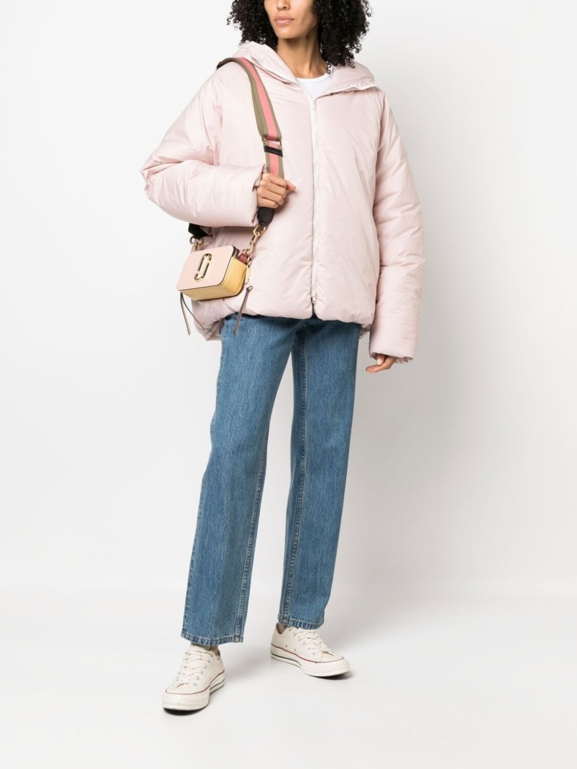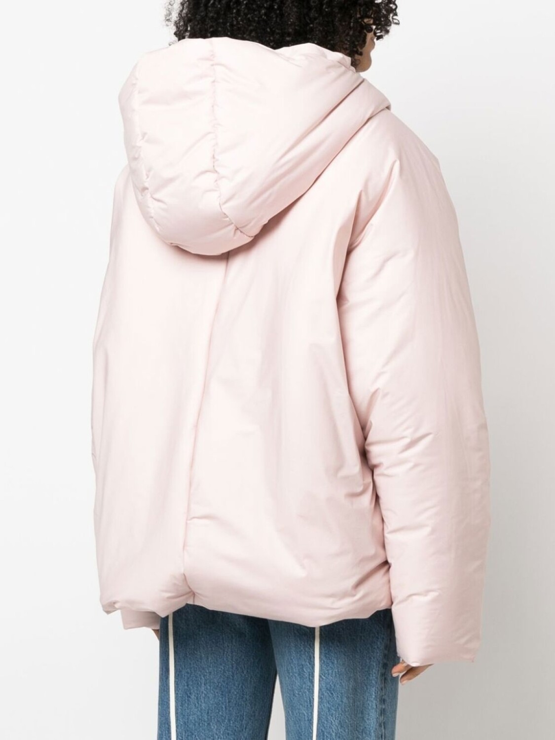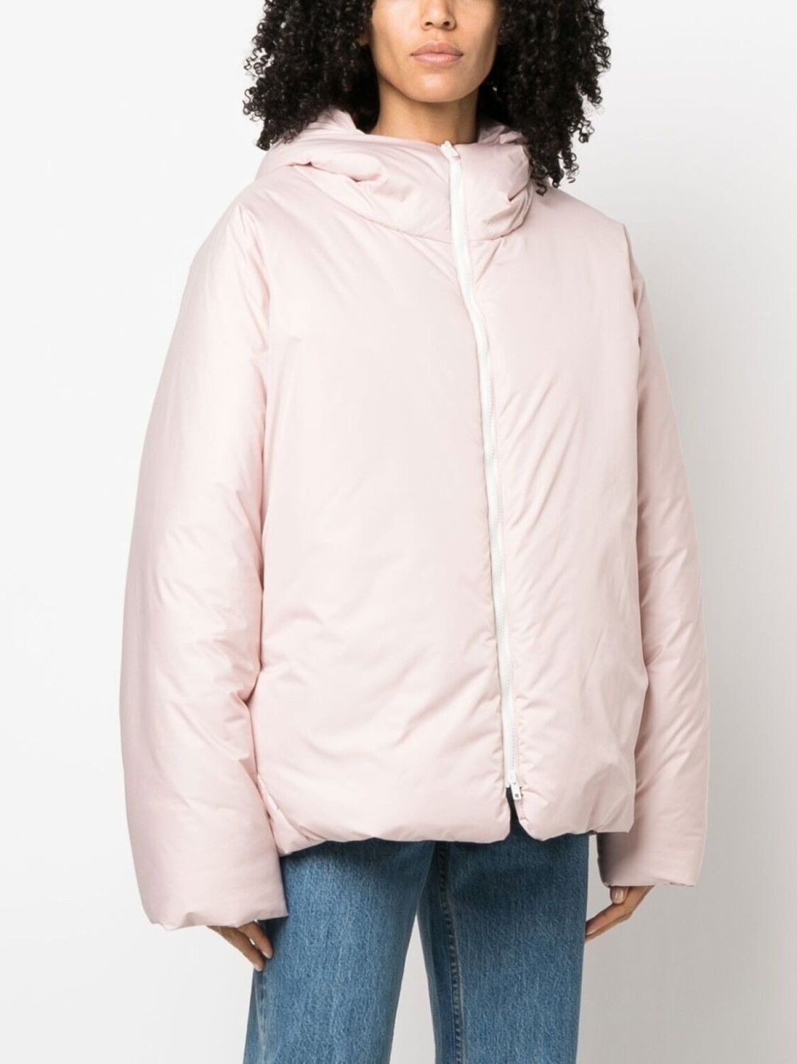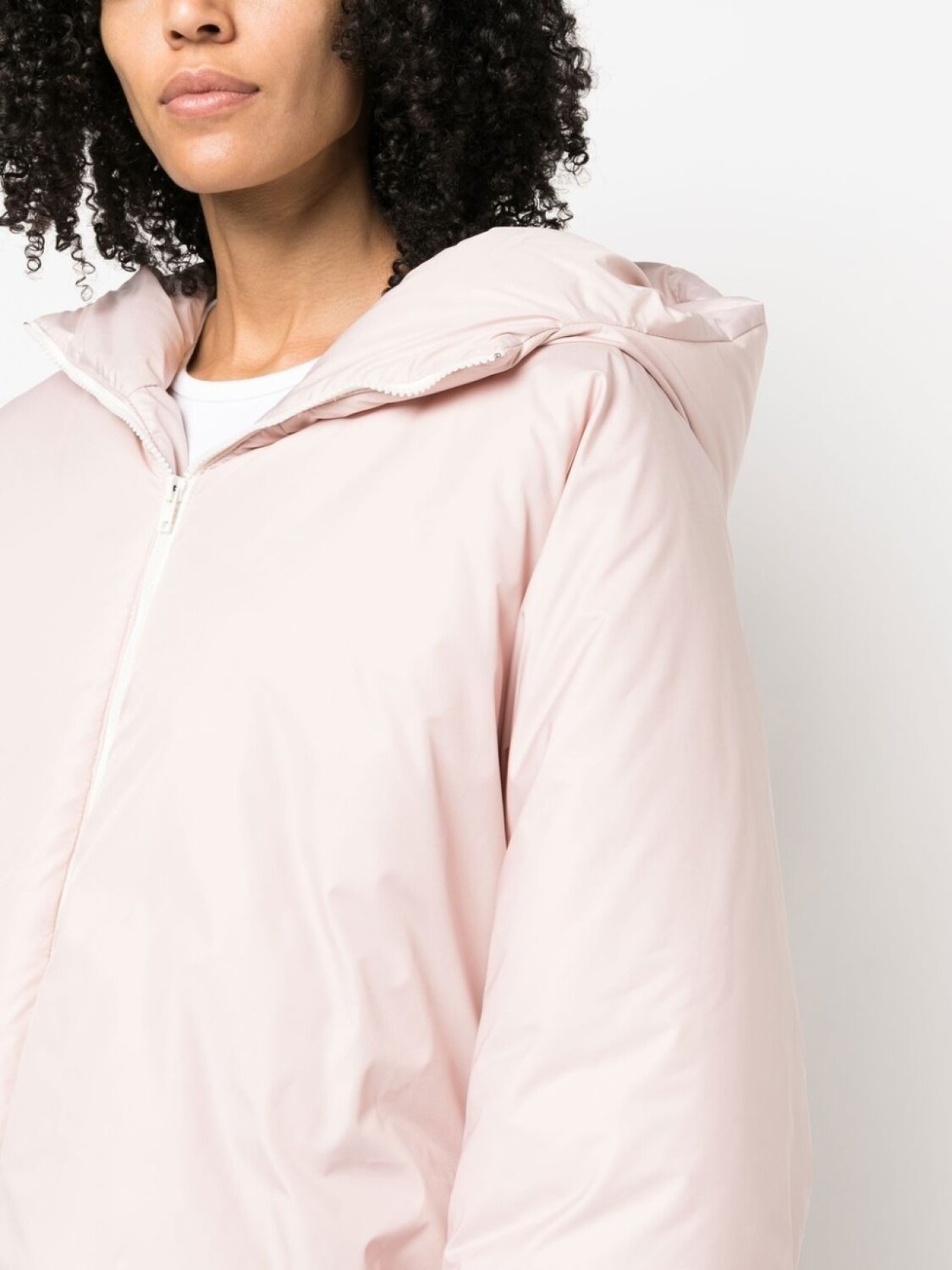 Пудрово-розовый, дутый материал, круглый вырез, длинные рукава и застежка на молнии спереди.