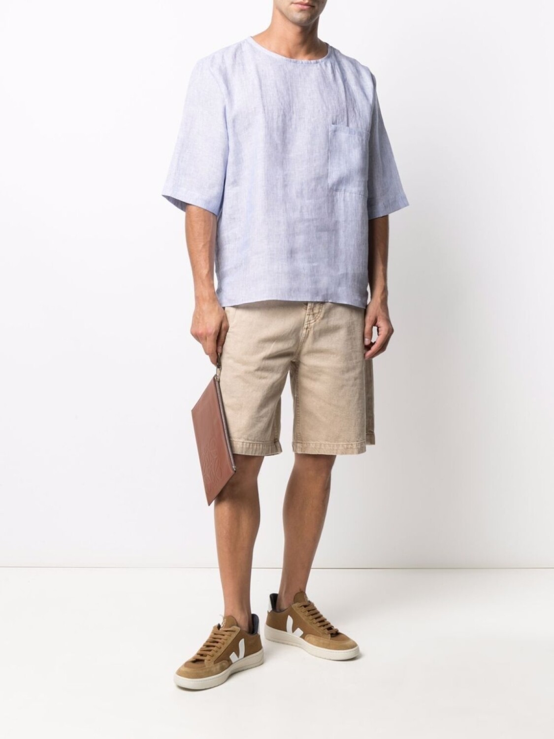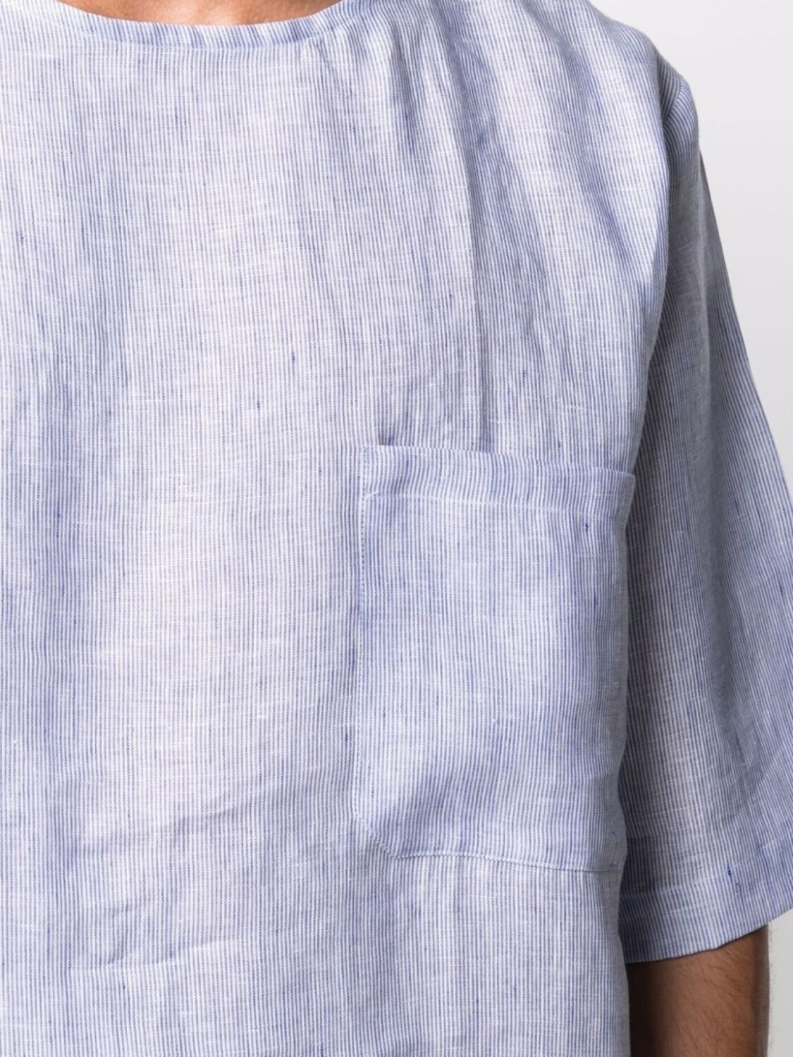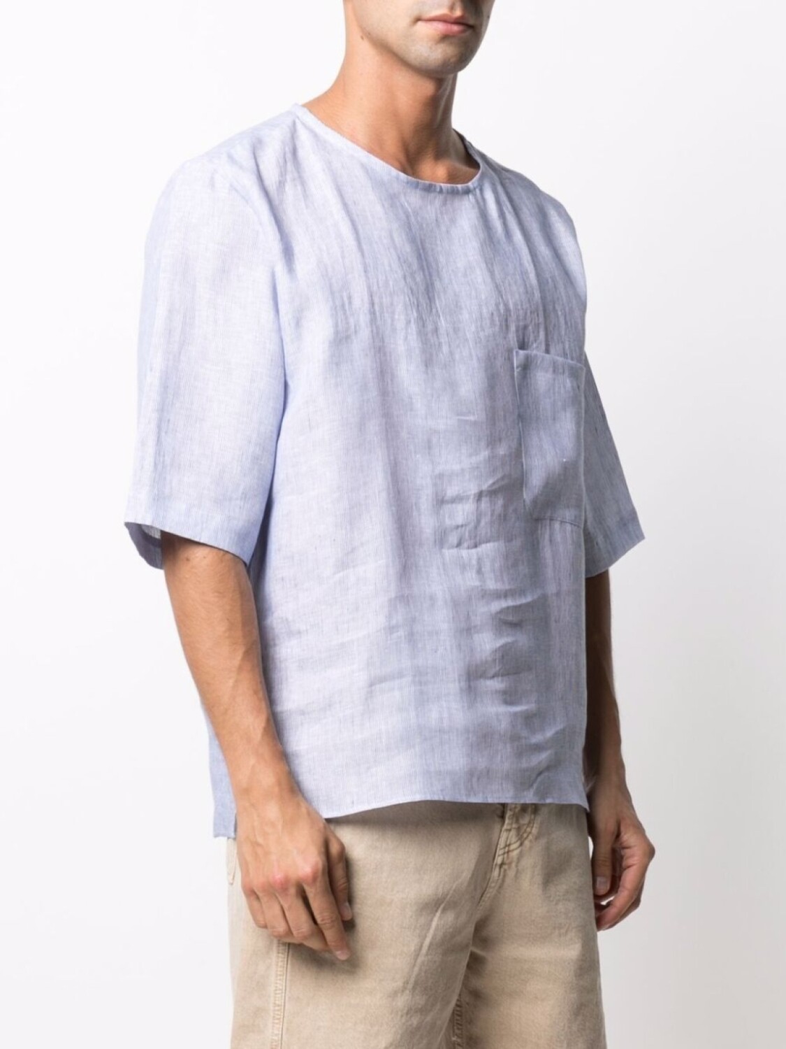 Круглый вырез, короткие рукава и нагрудный накладной карман. Цвет: синий. .