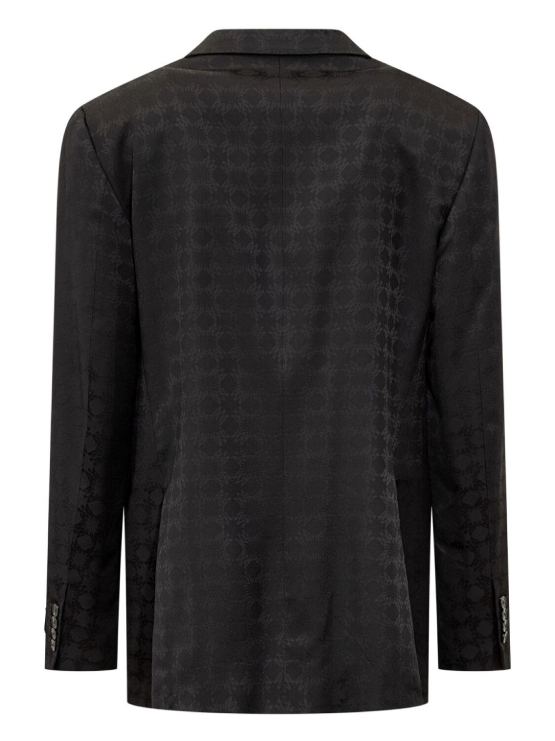 Черный двубортный пиджак с застежкой на пуговицы, заостренные лацканы, два накладных кармана по бокам, длинные рукава, прямой подол