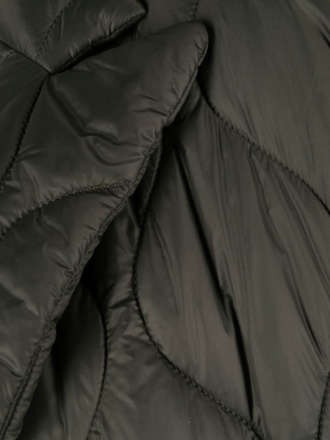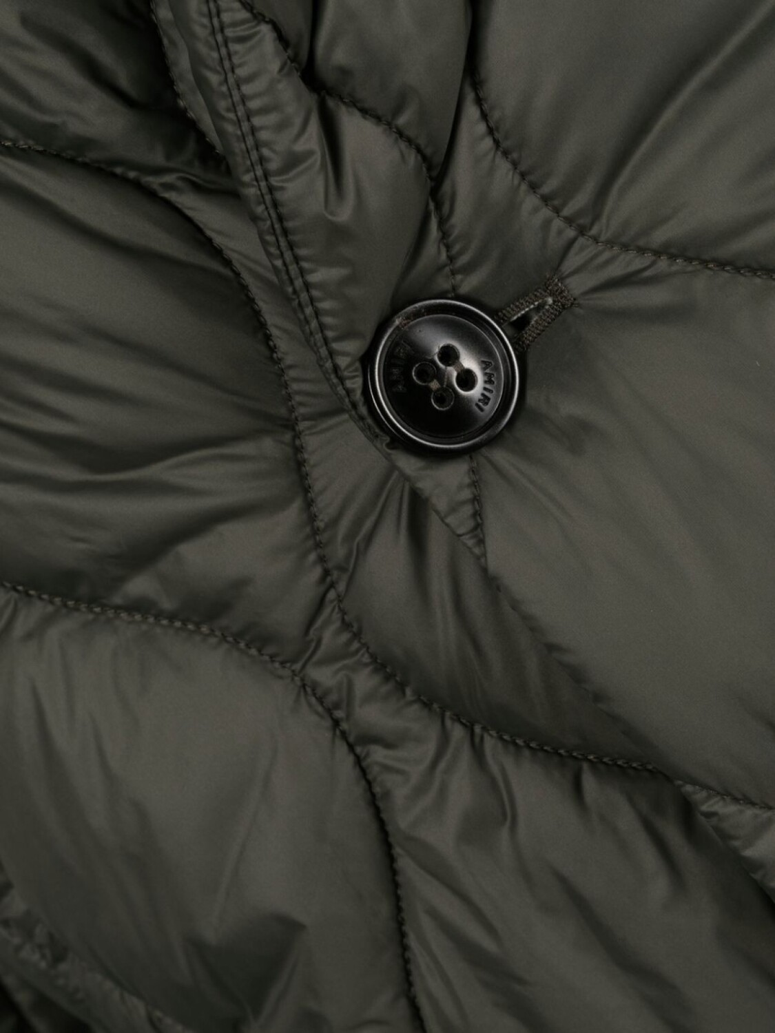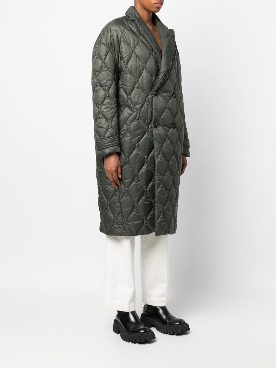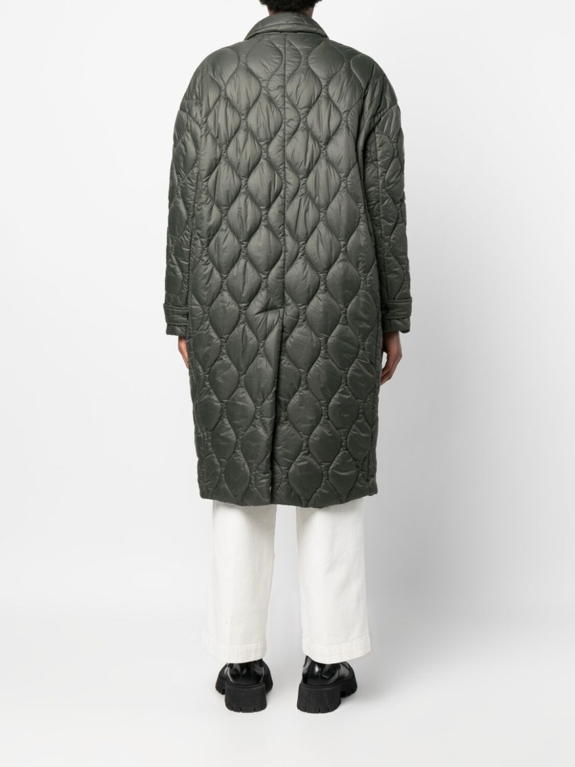Темно-зеленый, стеганая модель, классические лацканы, двубортная застежка на кнопки, длинные рукава и длина миди.