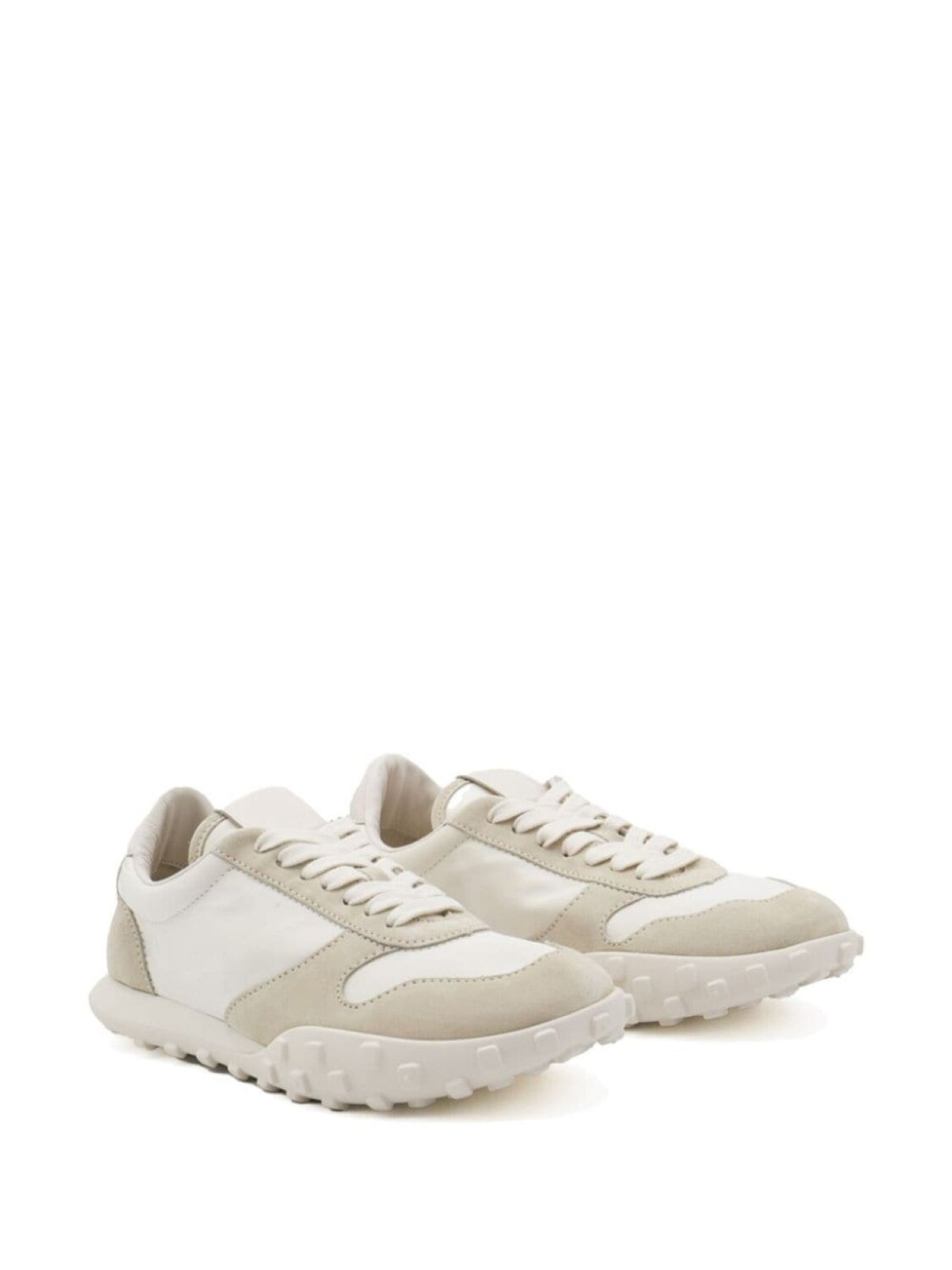 Белая бежевая телячья кожа замшевые вставки шнуровка спереди тисненый логотип сзади язычок с тиснением логотипа круглый носок фирменная кожаная стелька плоская резиновая подошва