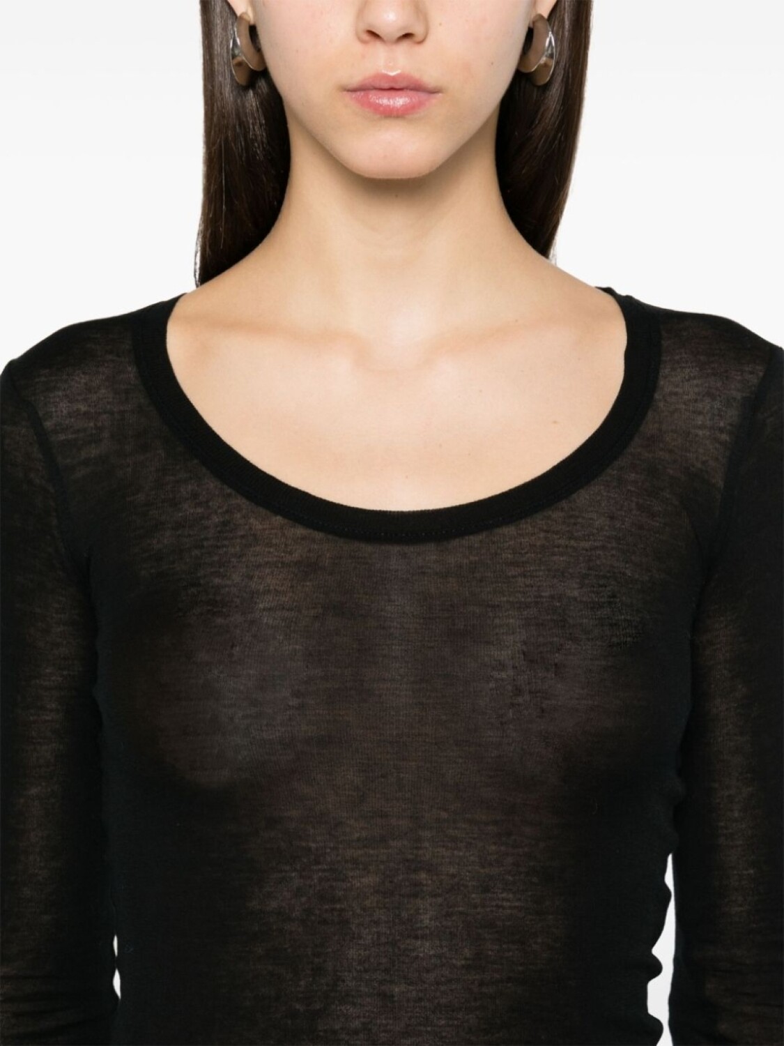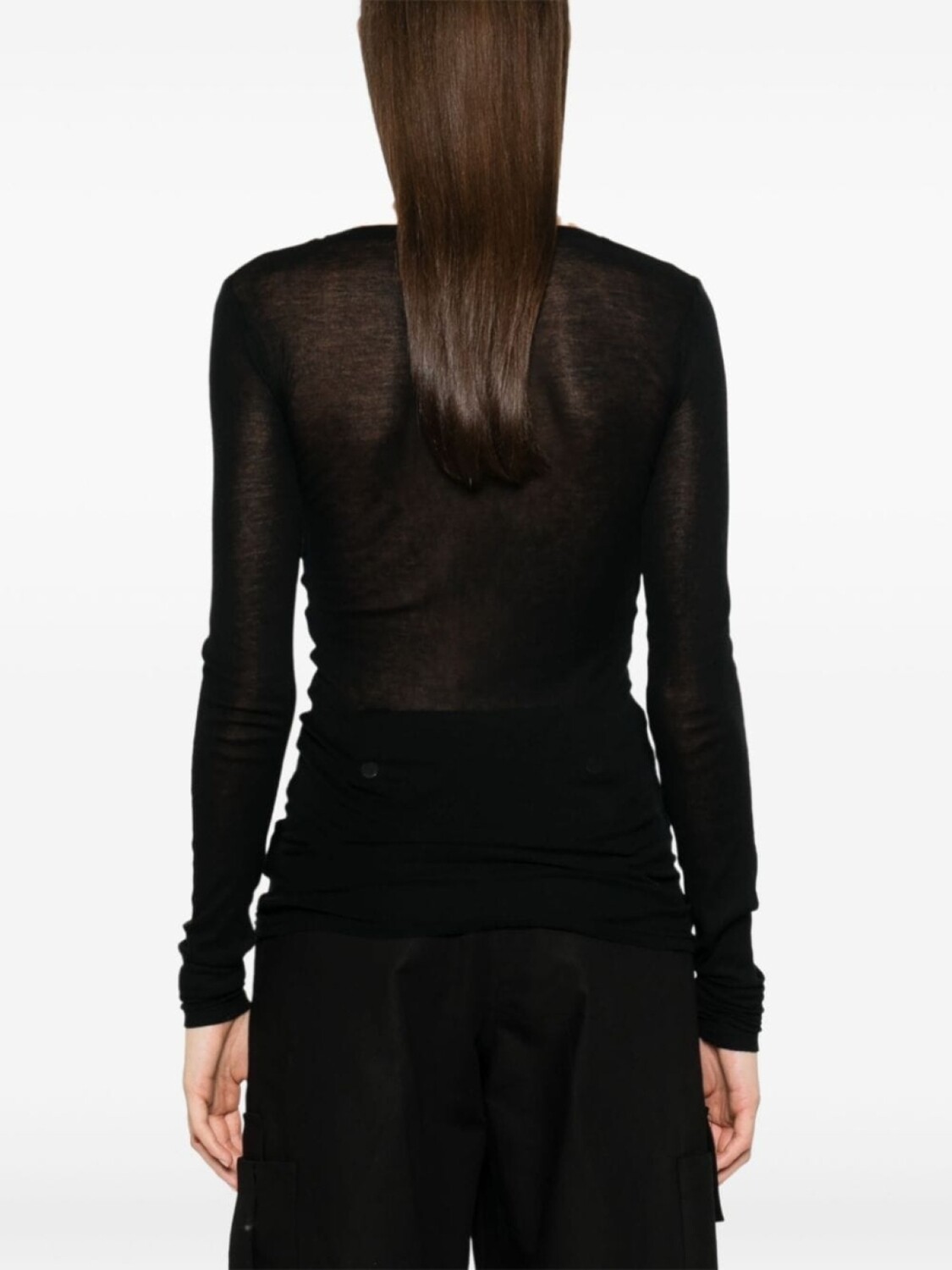 Черный хлопковый трикотаж, фактура, полупрозрачная конструкция, круглый вырез, длинные рукава, прямой подол