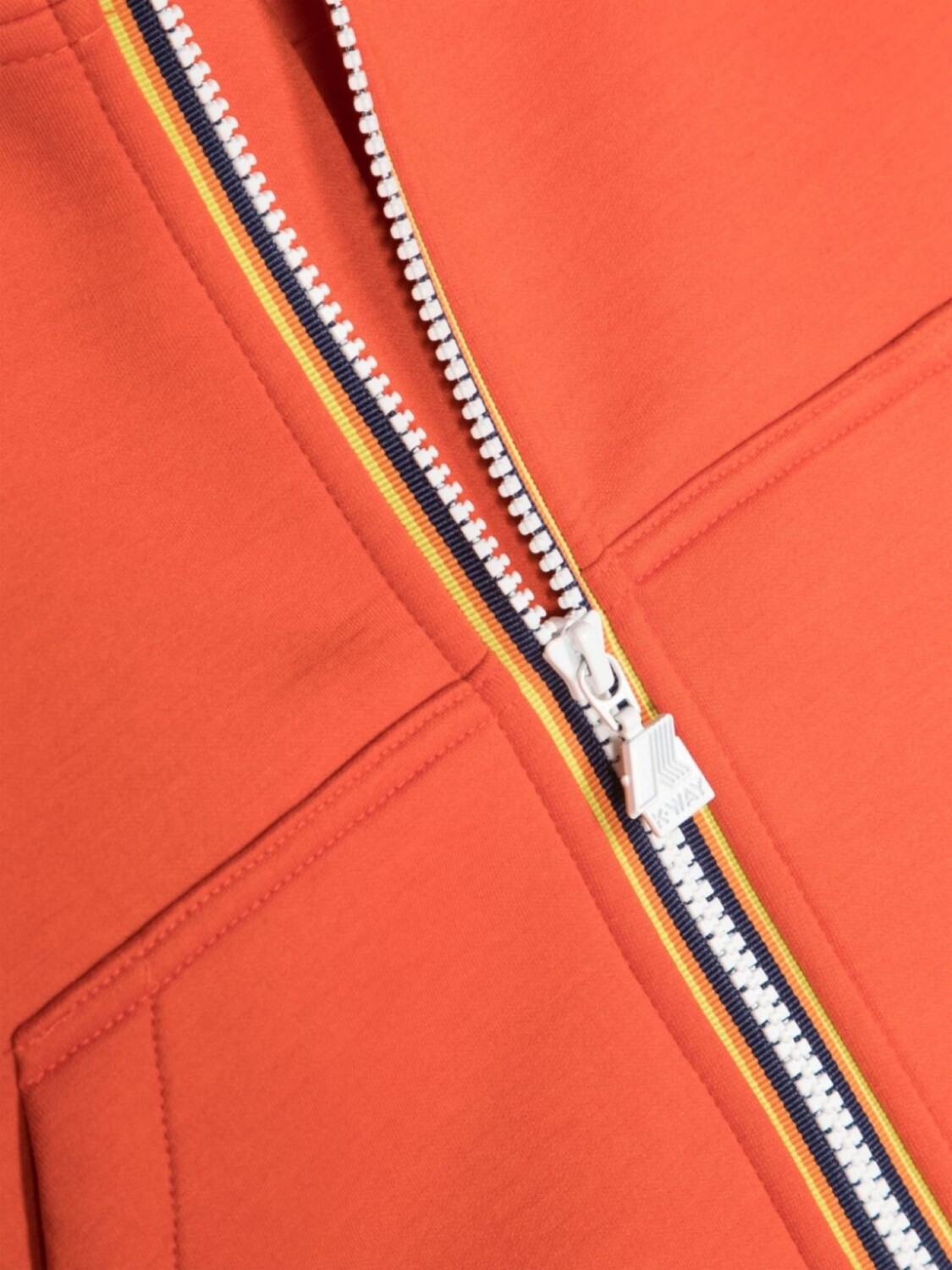 Тыквенно-оранжевый, эластичный материал, логотип-аппликация, полоски, застежка на молнии спереди, классический капюшон, карман-муфта, длинные рукава и прямой подол.