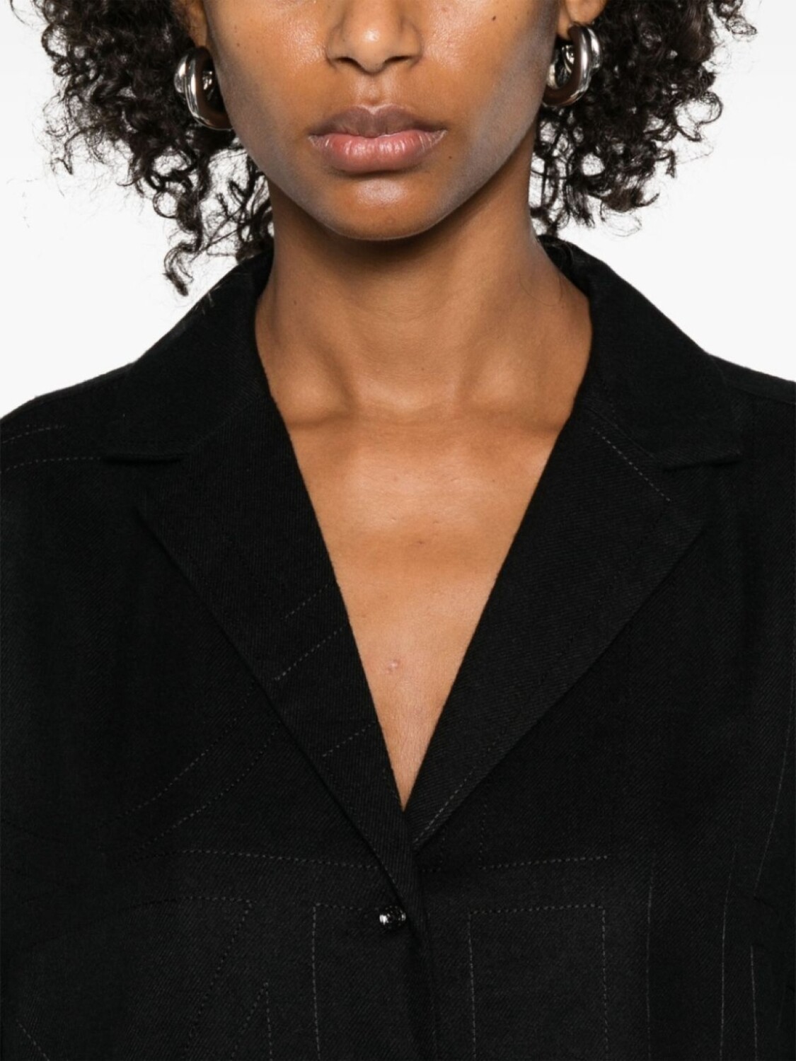 Черный, застежка на пуговицах спереди, зазубренные лацканы, длинные рукава