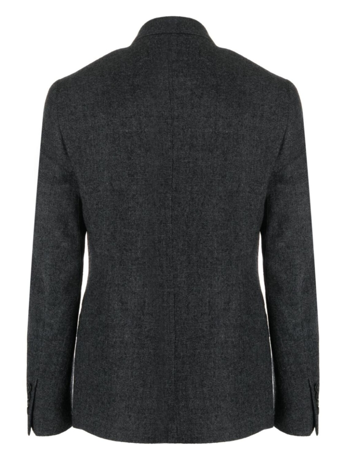 Серый, необработанная шерсть, клетчатый узор, заостренные лацканы, двубортная застежка на кнопки, длинные рукава, прорезной карман на груди и два передних кармана с клапанами.