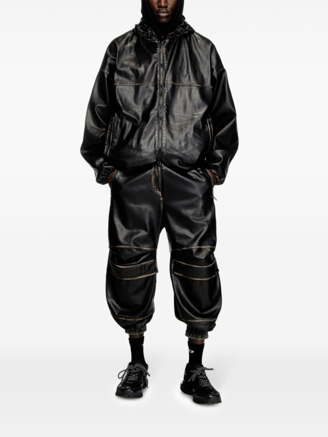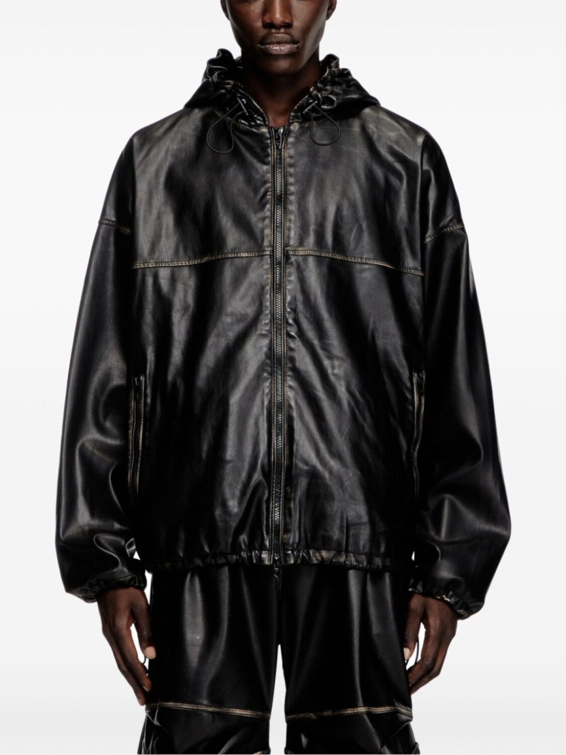 Черная искусственная кожа, двухсторонняя застежка-молния, капюшон на шнурке, длинные рукава, два боковых кармана с листочкой, манжеты на шнурке, низ на шнурке. При покупке этой вещи унисекс имейте в виду, что она отсортирована по стандартным мужским размерам.