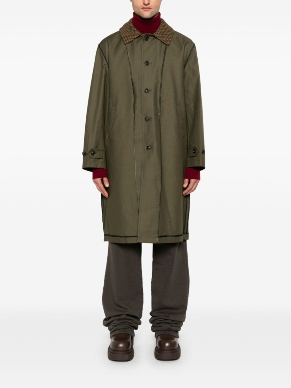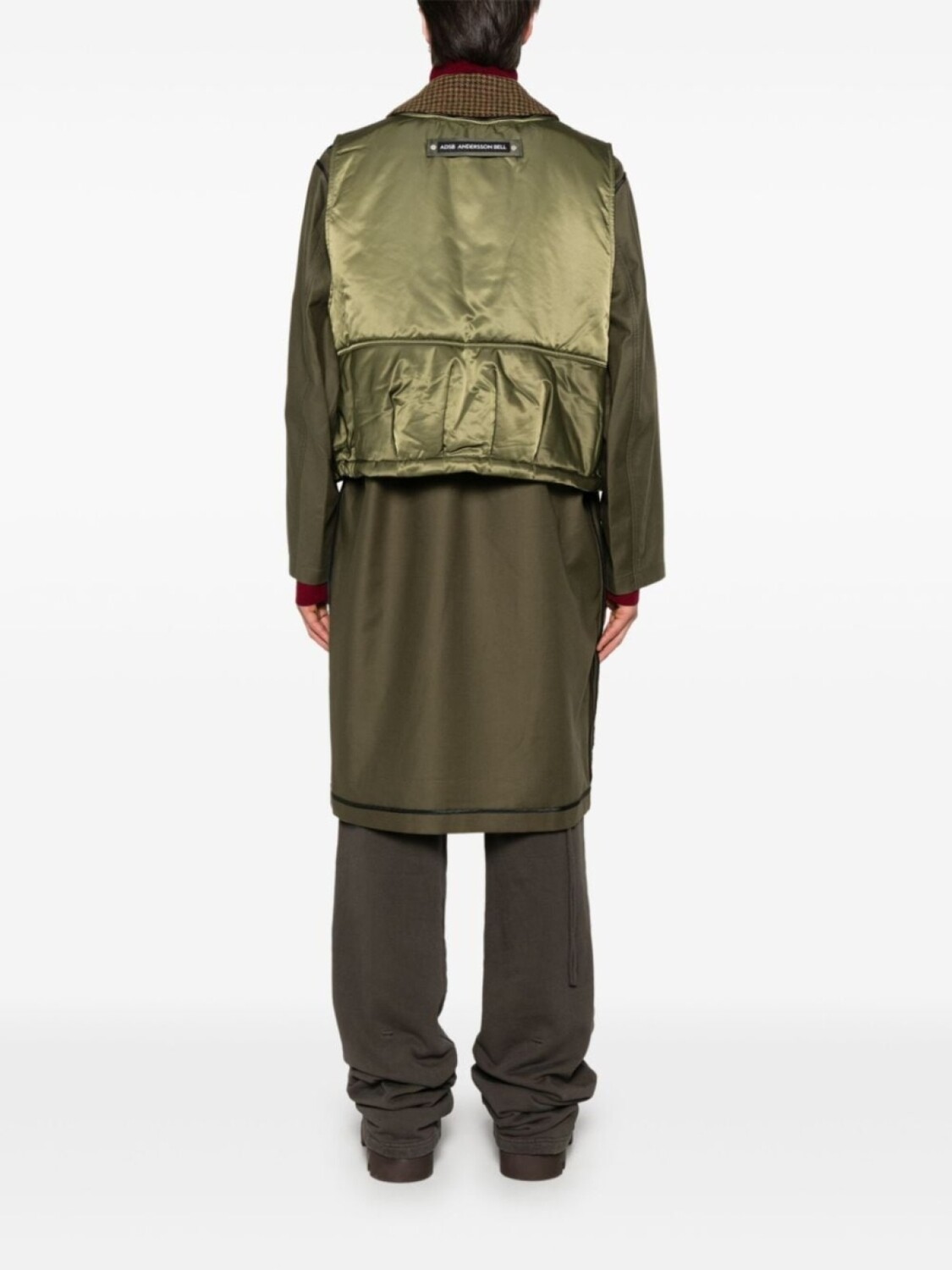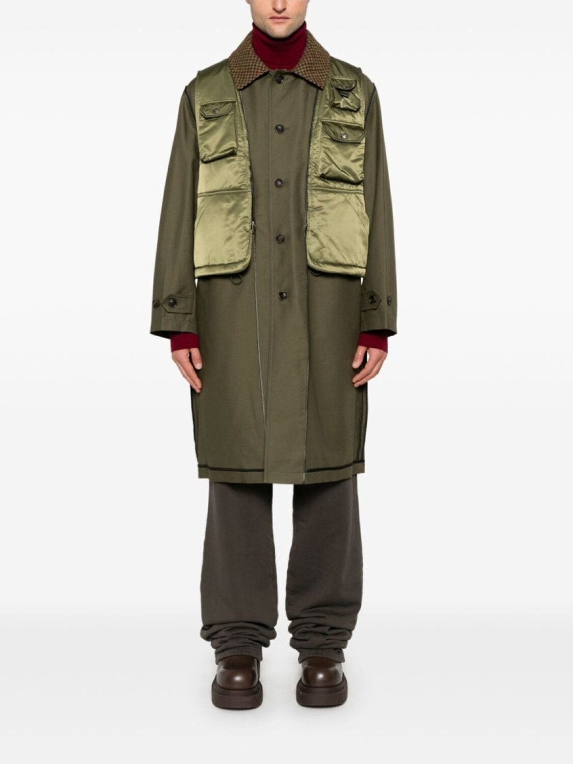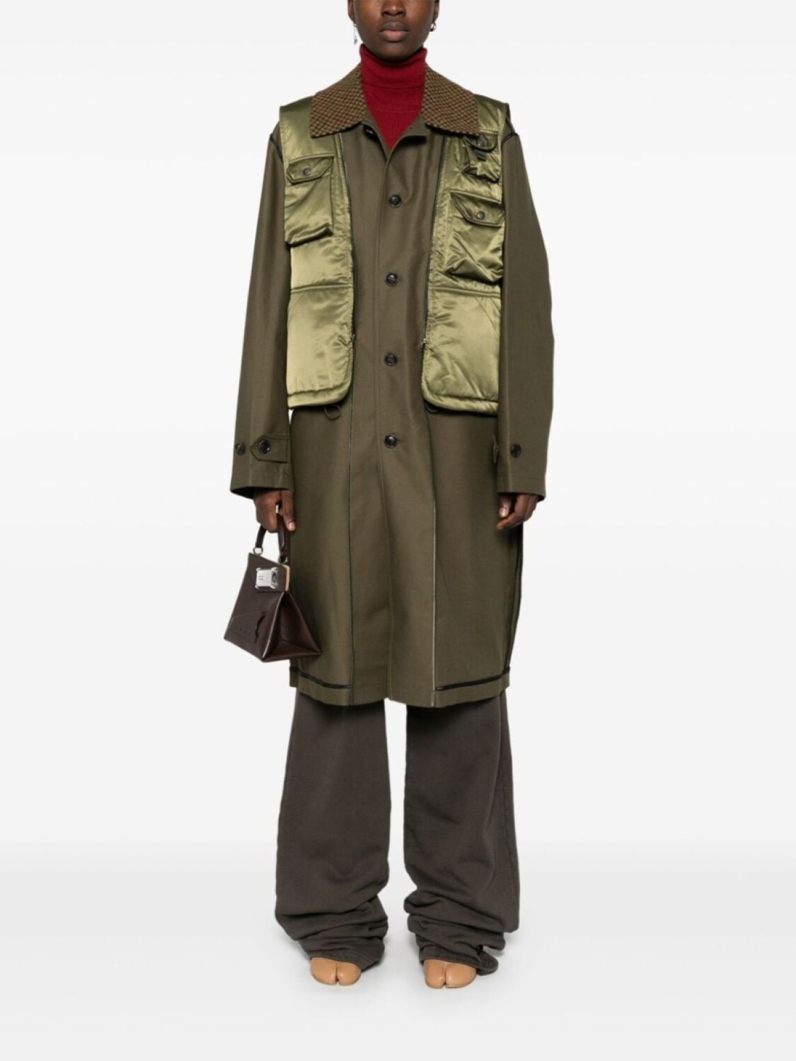 Хлопчатобумажная ткань цвета хаки с саржевым переплетением, многослойный дизайн, швы с эффектом «изнанки», застежка на пуговицы спереди, воротник с узором «гусиная лапка», длинные рукава, манжеты на пуговицах, съемный стеганый жилет, три нагрудных кармана с клапанами, два боковых прорезных кармана, нашивка с логотипом сзади, сборчатые детали, без подкладки, прямой подол, большая длина. При покупке этой вещи унисекс имейте в виду, что она классифицируется по стандартным мужским размерам.