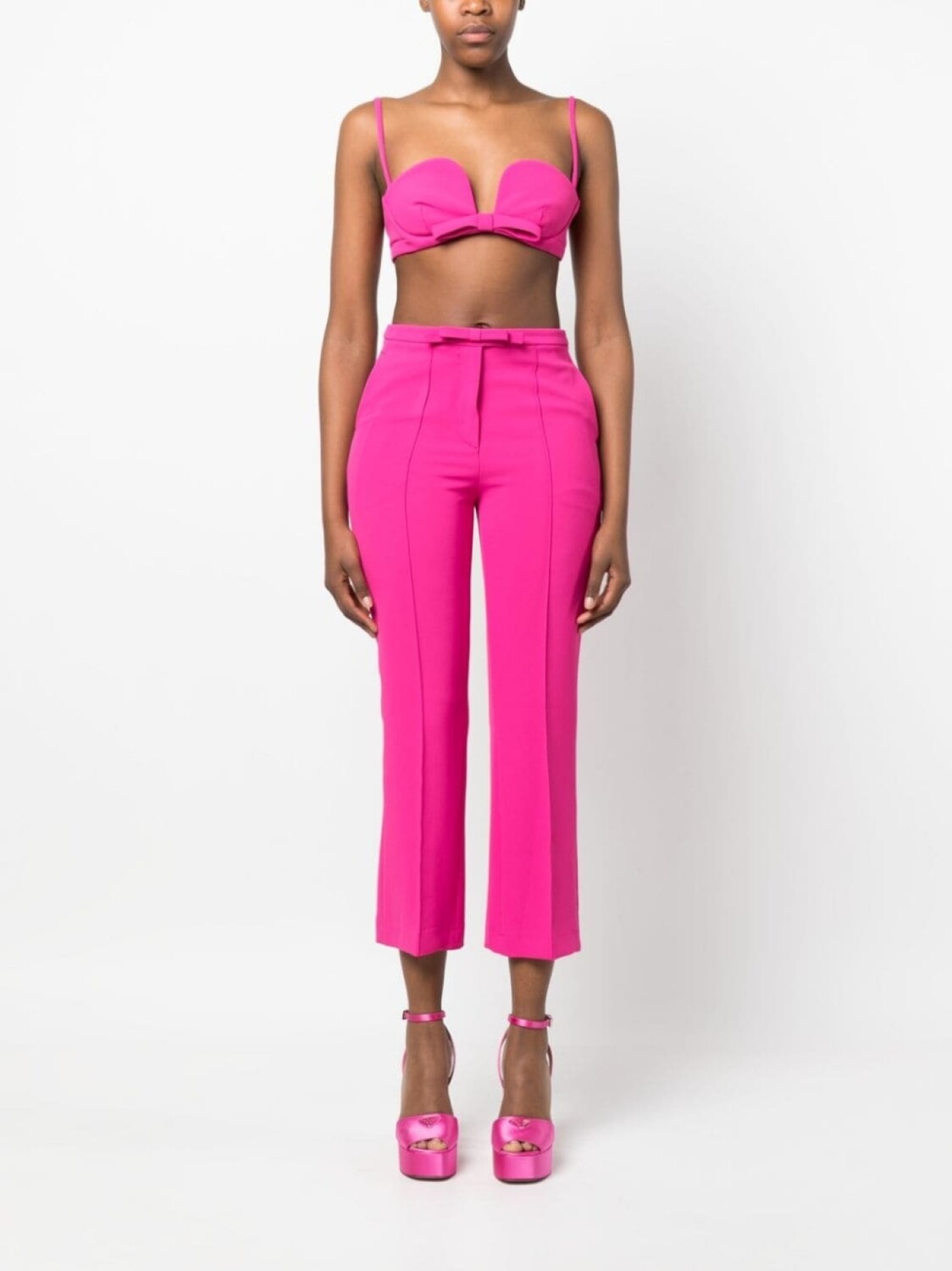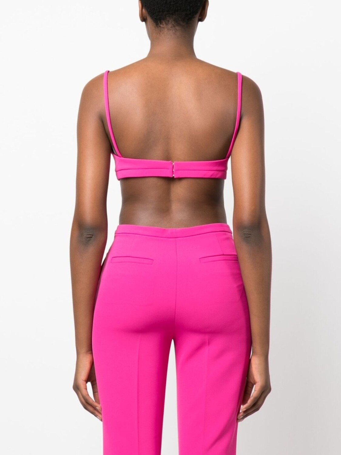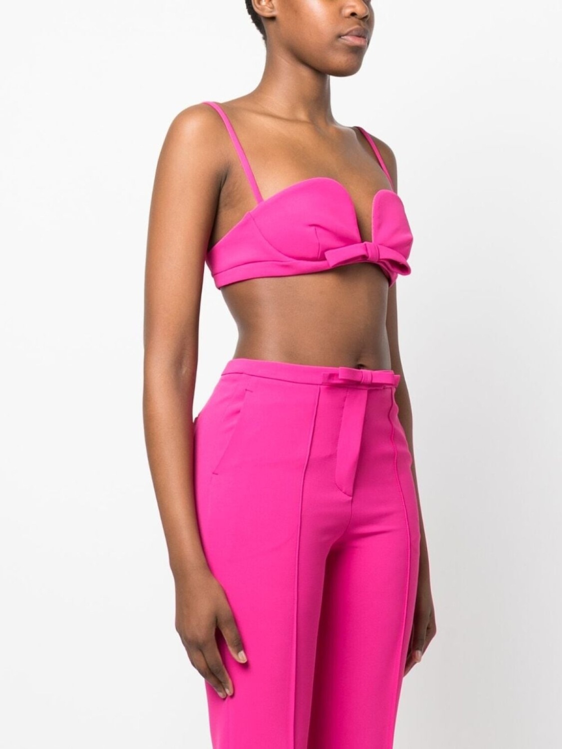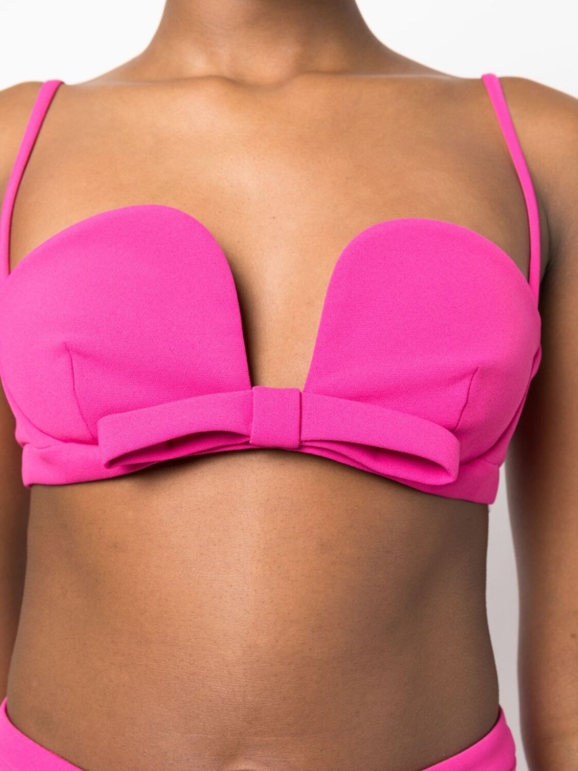 Фуксия, бант, тонкие бретели, без рукавов, застежка на зажиме сзади, чашка на косточках и укороченная длина.