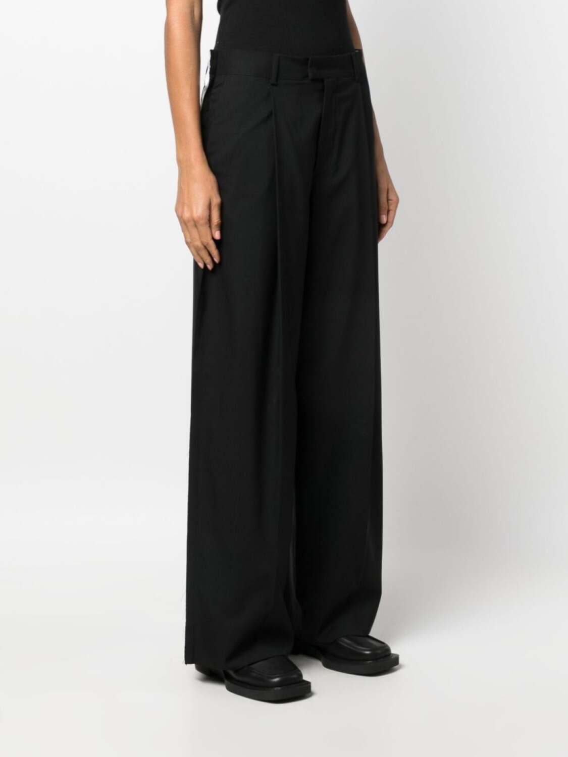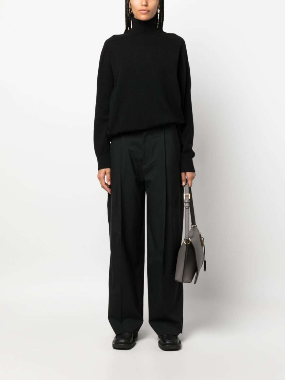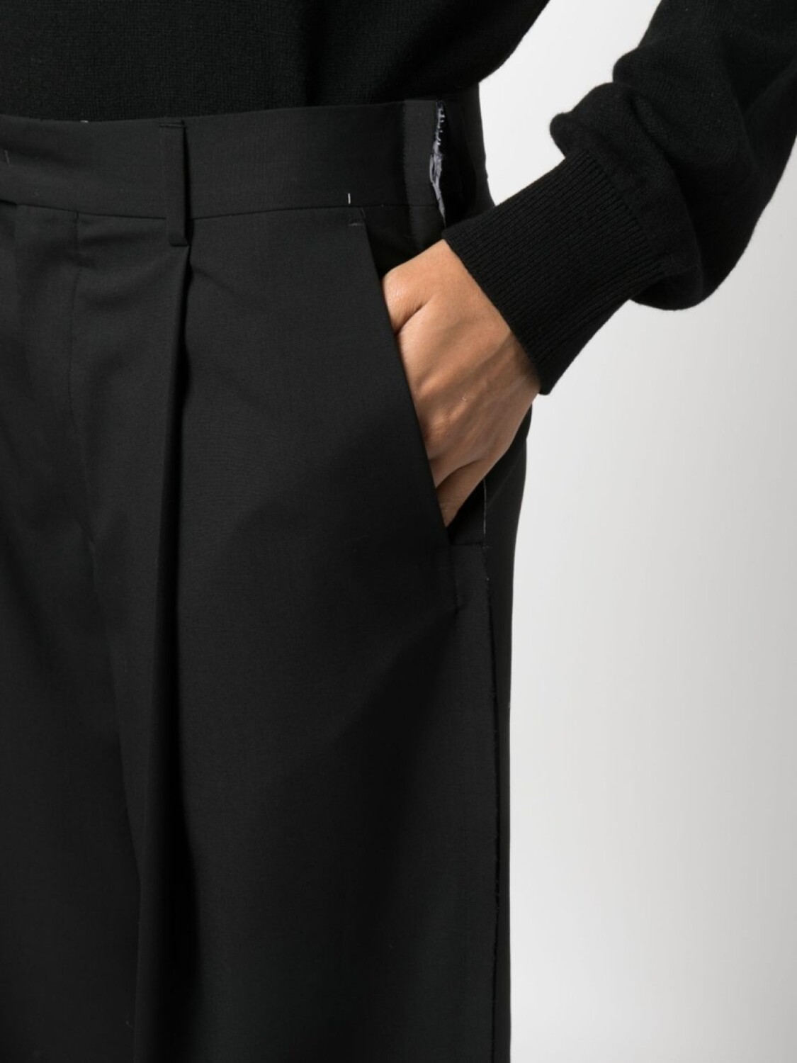 Черный, шерсть, крой палаццо, складки, низкая посадка, петли для ремня, смещенная застежка на пуговицах спереди и два прорезных кармана по бокам.