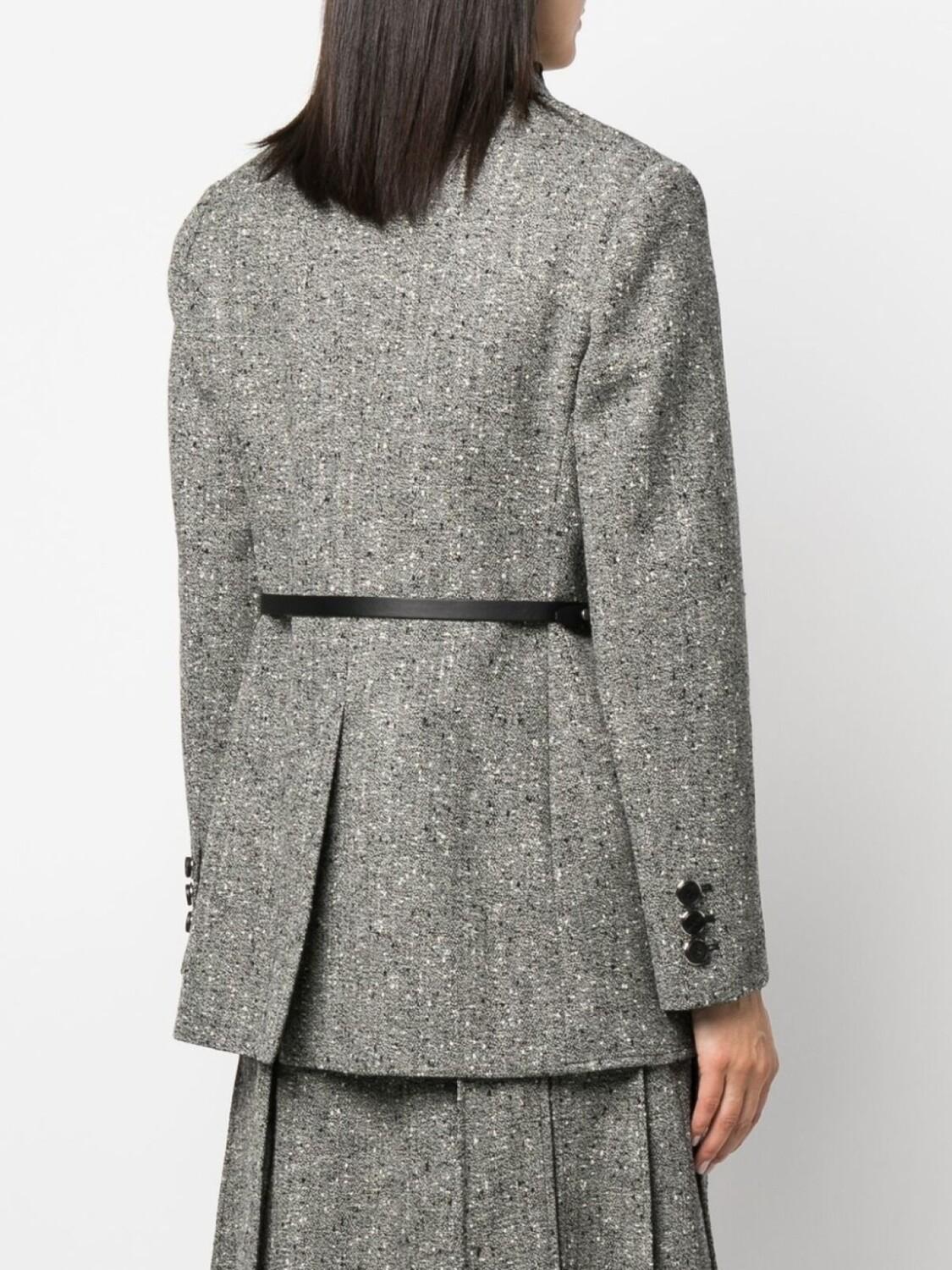 Серый, смесовая необработанная шерсть, заостренные лацканы, застежка на пуговицах спереди, манжеты на пуговицах, два передних кармана с клапанами, кожаная отделка и прямой подол.