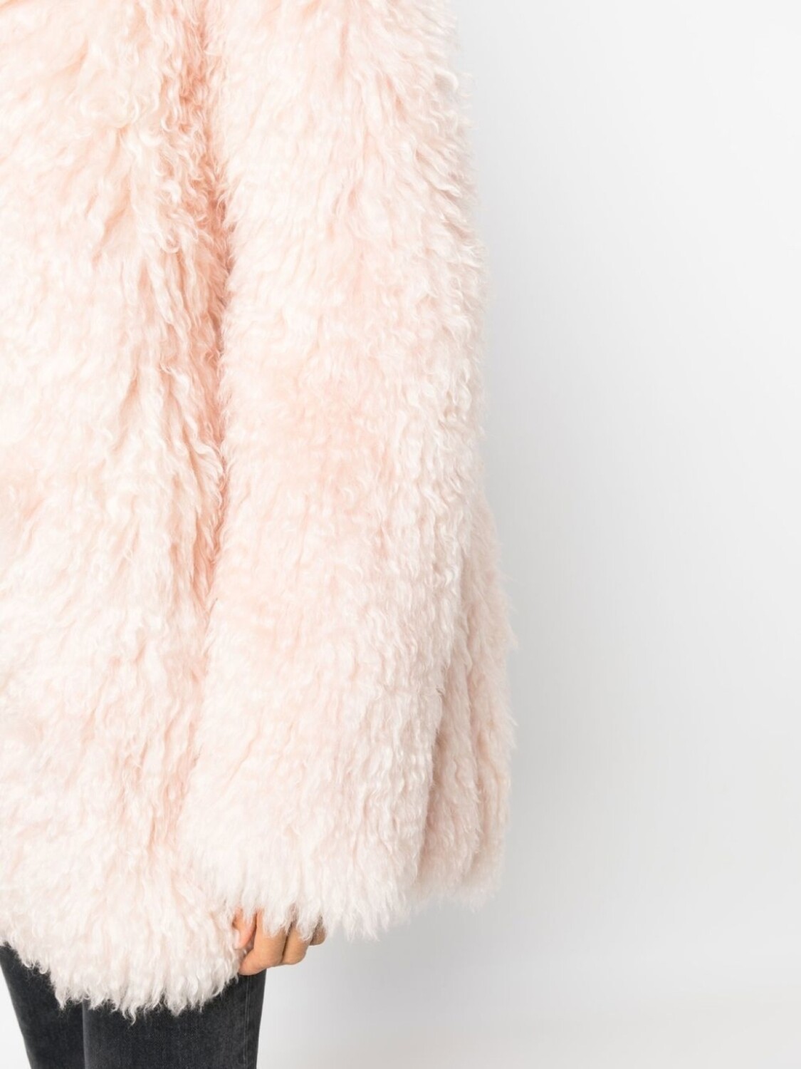 Светло-розовый, мохер, оправа оверсайз, длинные рукава и потайная застежка спереди.