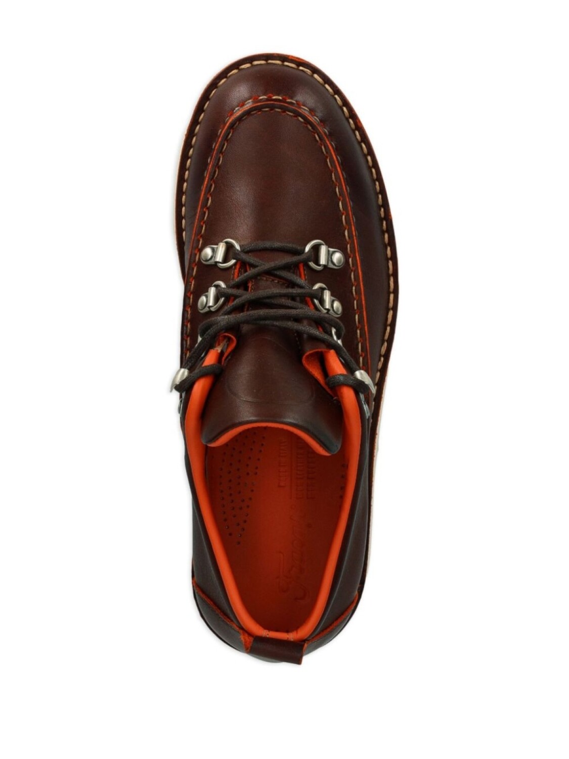 Шоколадно-коричневая шнуровка спереди, язычок на пятке, фирменная кожаная стелька, резиновая подошва
