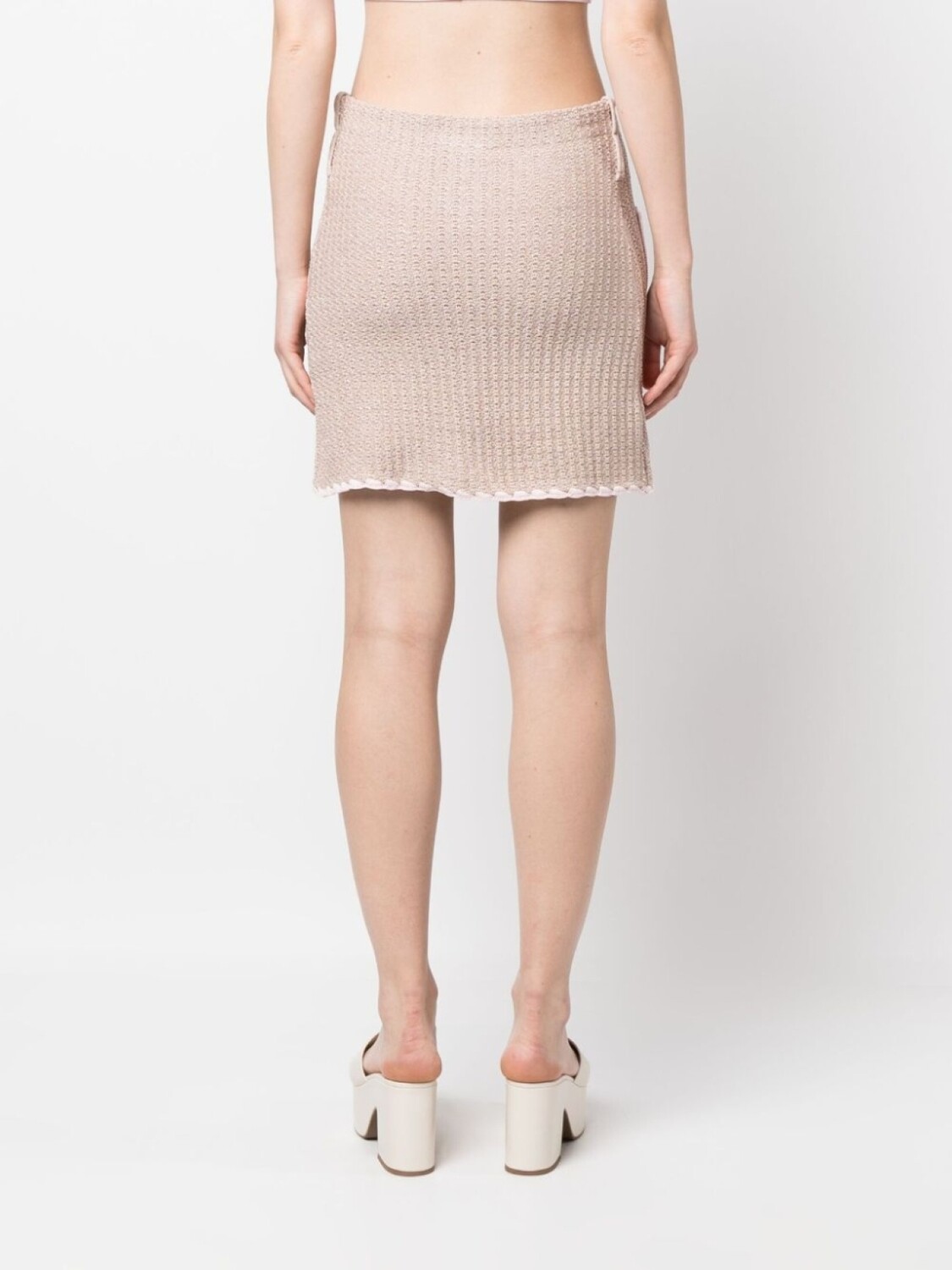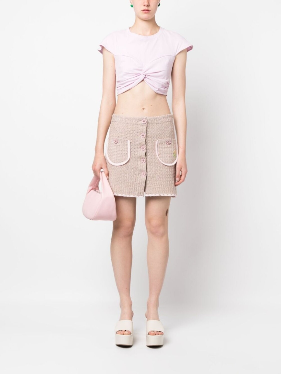 Светло-бежевый, светло-розовый, смесовый хлопок, трикотажный материал, цветочная вышивка спереди, застежка на пуговицах спереди, петли для ремня, карманы на двух пуговицах, подол с фестонами и длина до бедер.