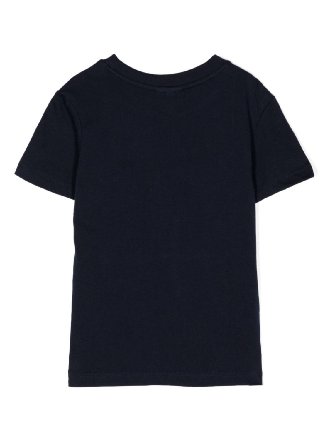 Темно-синий, хлопок, нашивка с логотипом на груди, круглый вырез, короткие рукава и прямой подол.