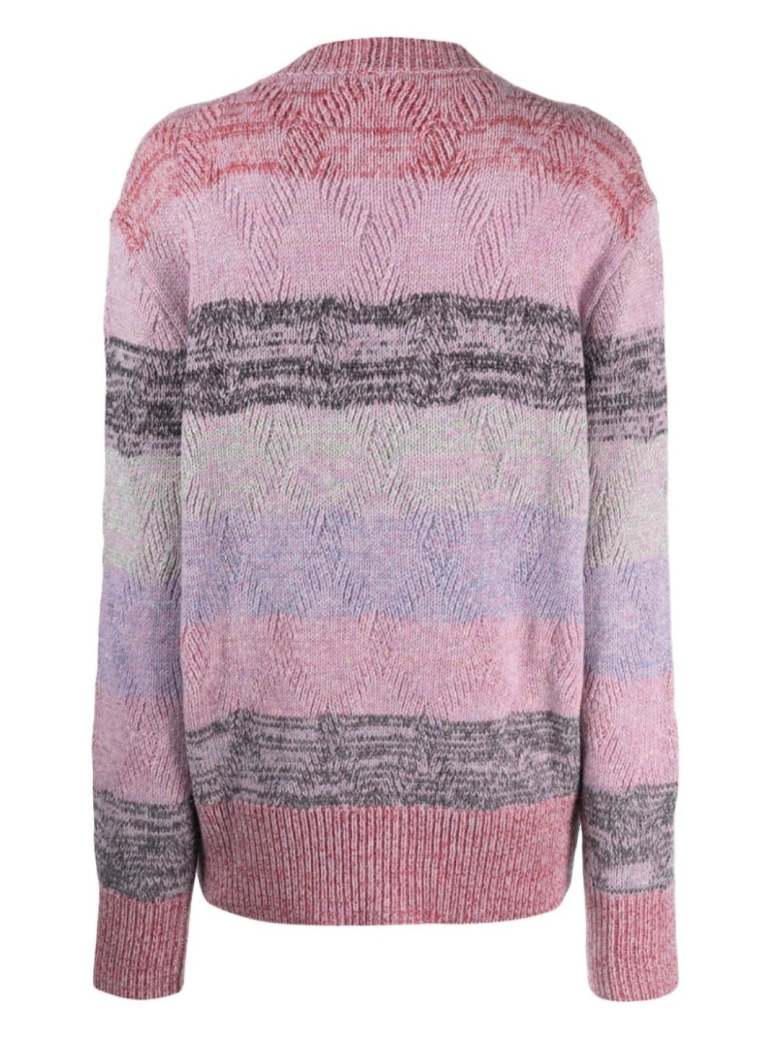 Розовый, разноцветный, смесовая шерсть, трикотажный материал, вязаные края в рубчик, узор в горизонтальную полоску, контрастная отделка, застежка на пуговицах спереди, длинные рукава, два накладных кармана спереди и прямой подол.