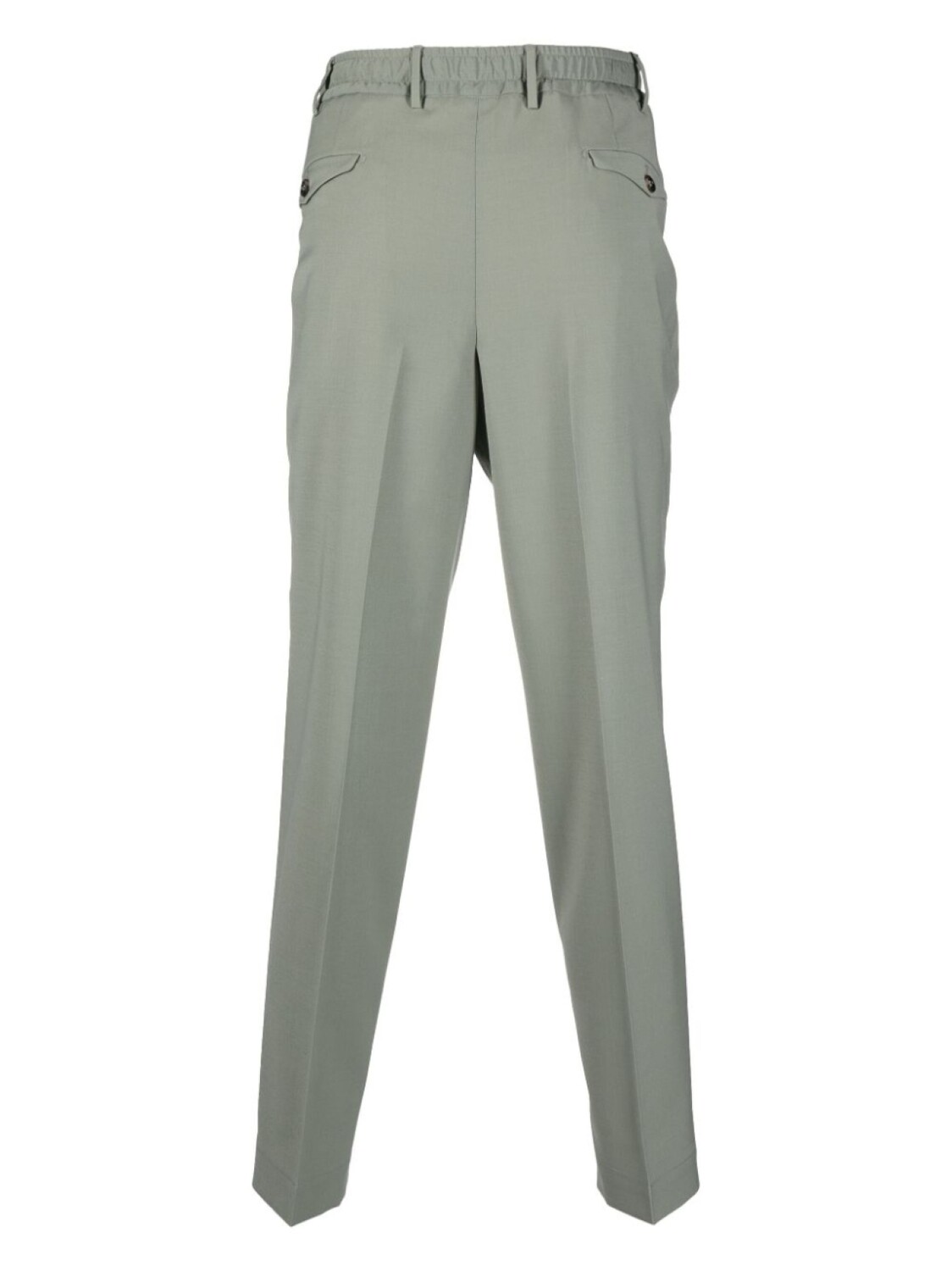 Светло-зеленый, эластичный материал, классический крой, петли для ремня, эластичный пояс сзади, застежка на молнии и пуговице спереди, два прорезных кармана на пуговицах сзади и зауженный крой.