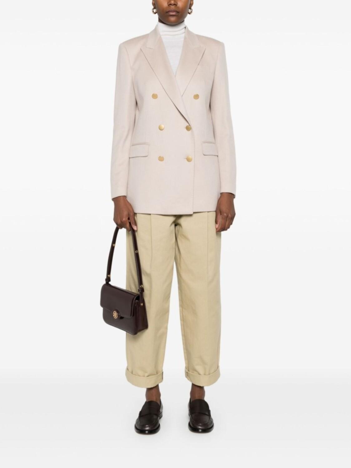 Песочно-бежевый, кашемир, матовое покрытие, двубортная застежка на пуговицы, заостренные лацканы, подплечники, длинные рукава, манжеты на пуговицах, прорезной карман на груди, два кармана с клапанами по бокам, шлица по центру сзади, цельная подкладка, прямой подол