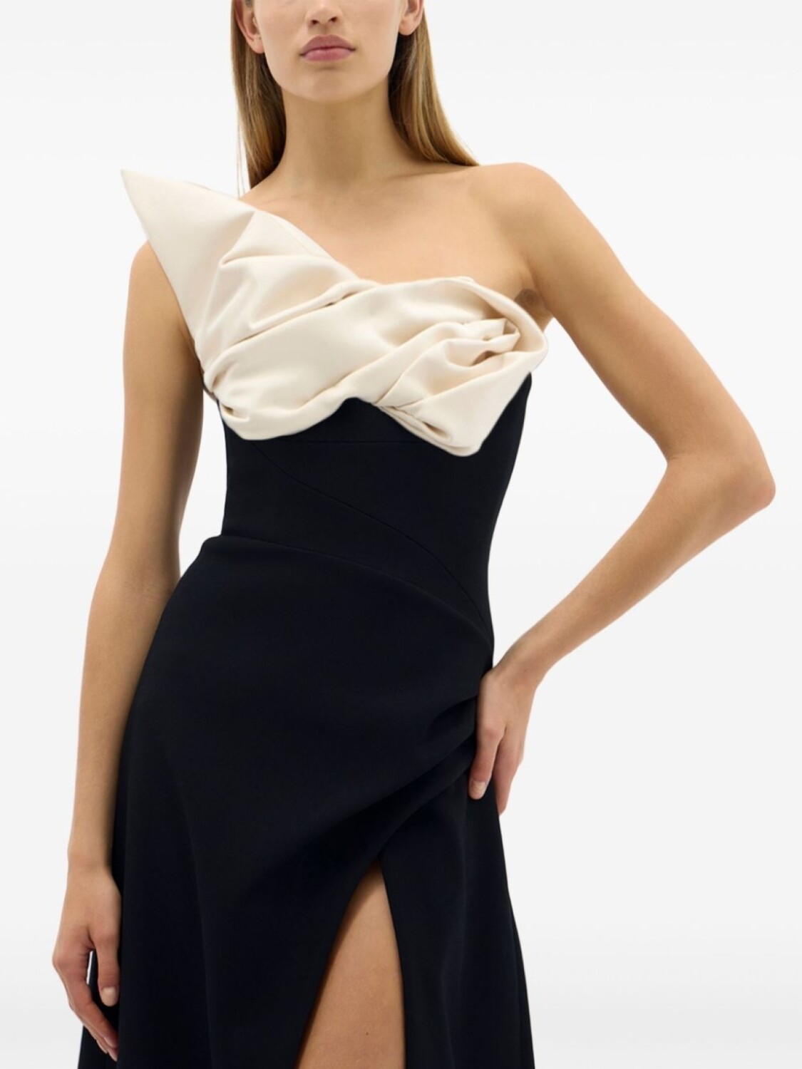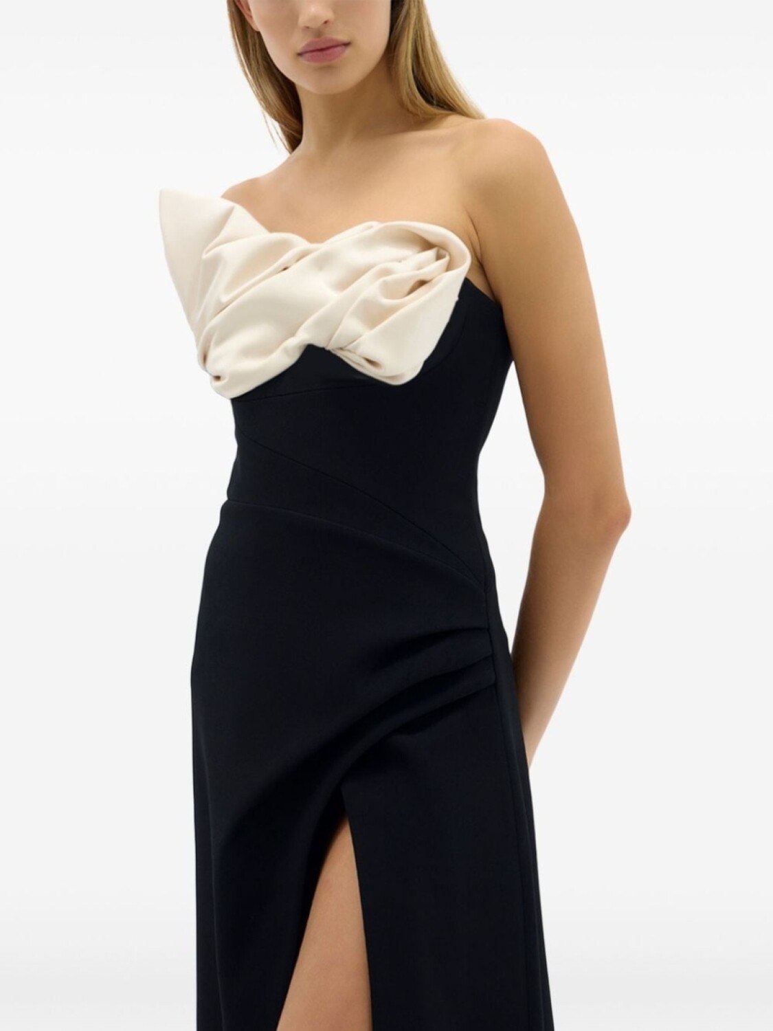 Черный/кремовый, сочетание двух оттенков, драпировка, асимметричный вырез, потайная застежка на молнии сзади, без бретелей, приталенный силуэт, разрез спереди, длина макси